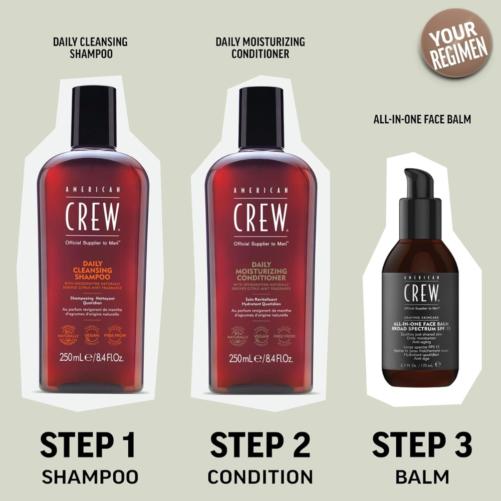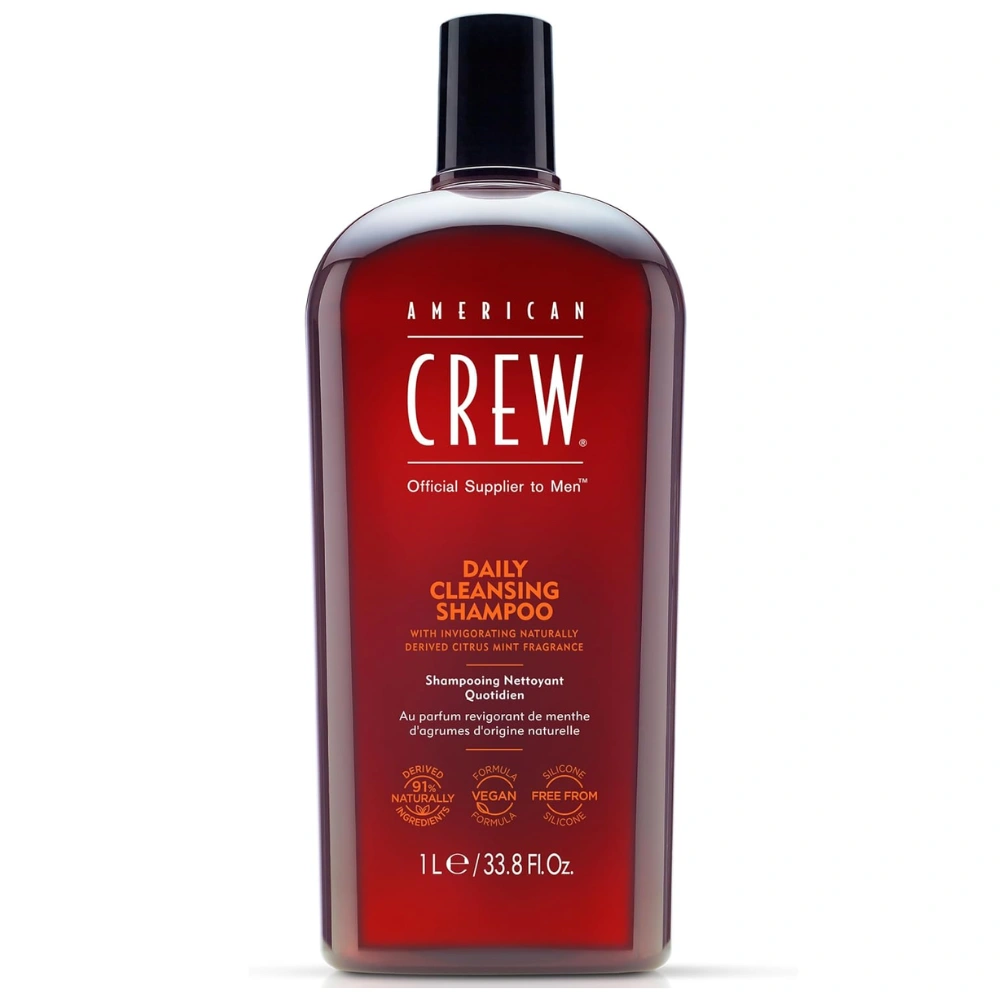 American Crew Daily Cleansing Shampoo for Men (1000ml) is a gentle, daily-use shampoo formulated to remove excess oil and impurities from the hair and scalp without stripping away natural moisture. Ideal for men with normal to oily hair, it features plant-derived cleansing agents that provide an effective yet mild lather. Enriched with Vitamin B5 (Panthenol) for hydration and softness, the formula also includes natural extracts like rosemary, thyme, and chamomile to soothe and invigorate the scalp. The shampoo is vegan, silicone-free, and lightly scented with American Crew’s signature Citrus Mint fragrance, leaving hair feeling clean, refreshed, and manageable every day.
