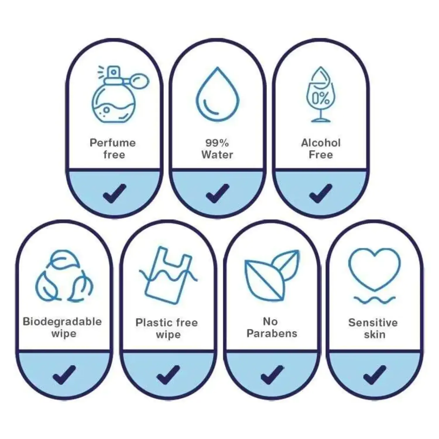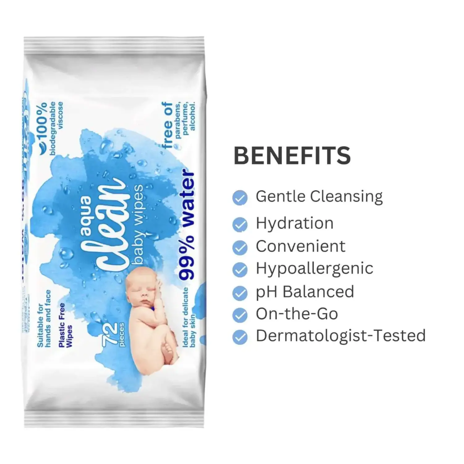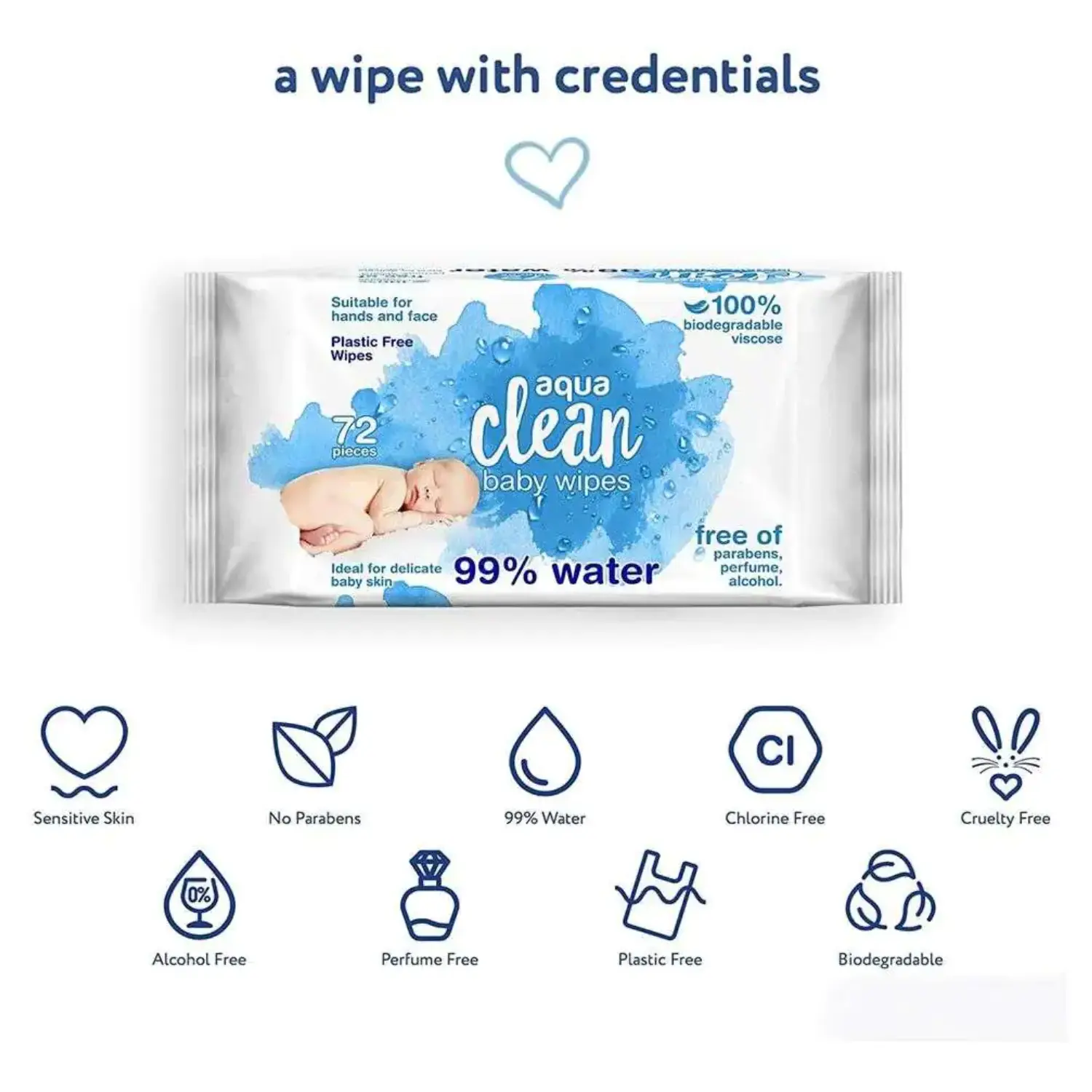 Pure and Gentle elements for skin protectionInfant’s skin is more delicate and can easily prone to damage and irritation. Aqua baby cleansing wipes are made with cotton to give a soft and gentle touch to infants like a warm mother’s hug. The majority of health care professionals recommend water-based wipes for premature as well as new-born. Our baby cleaning wipes are 99% based on triple filtered water for smoothly cleanse the sensitive skin of adolescents. Natural aloe vera extracts are also included in these baby wipes to boost up their effectiveness. Aloe vera is enriched with Vitamin A, C, Anti-oxidants, and enzymes that are critical for exfoliating and moisturizing skin. Citrus acid is citrus plant extracts that are a natural disinfectant against germs and bacteria. Our baby wipes provide a matchless blend of water and plant extracts to keep your little one’s skin soft and smooth and safe from germs. Suitable for most sensitive skinOur product is enriched with ingredients that are mild on the skin. Therefore, it is appropriate for all skin types ranging from sensitive skin to newborn. Due to heavy aqua content, it is genuinely gentle enough for even premature. Clinically approved and Chemical + fragrance-freeAqua wipes is a vegan-friendly unscented baby wipes product. It is a dermatologically tested and NHS-approved product. Hence, completely safe for your young ones. Aqua wipes are do not have any artificial perfume. It’s a purely organic baby wipes that are entirely free from alcohol, paraben, plastic, hypoallergenic, and many other harmful chemicals that cause sensitive skin to breakdown. Ideally recommended usesOur organic water-based baby wipes perfect for :Diaper changingWiping off baby’s hand and face.
