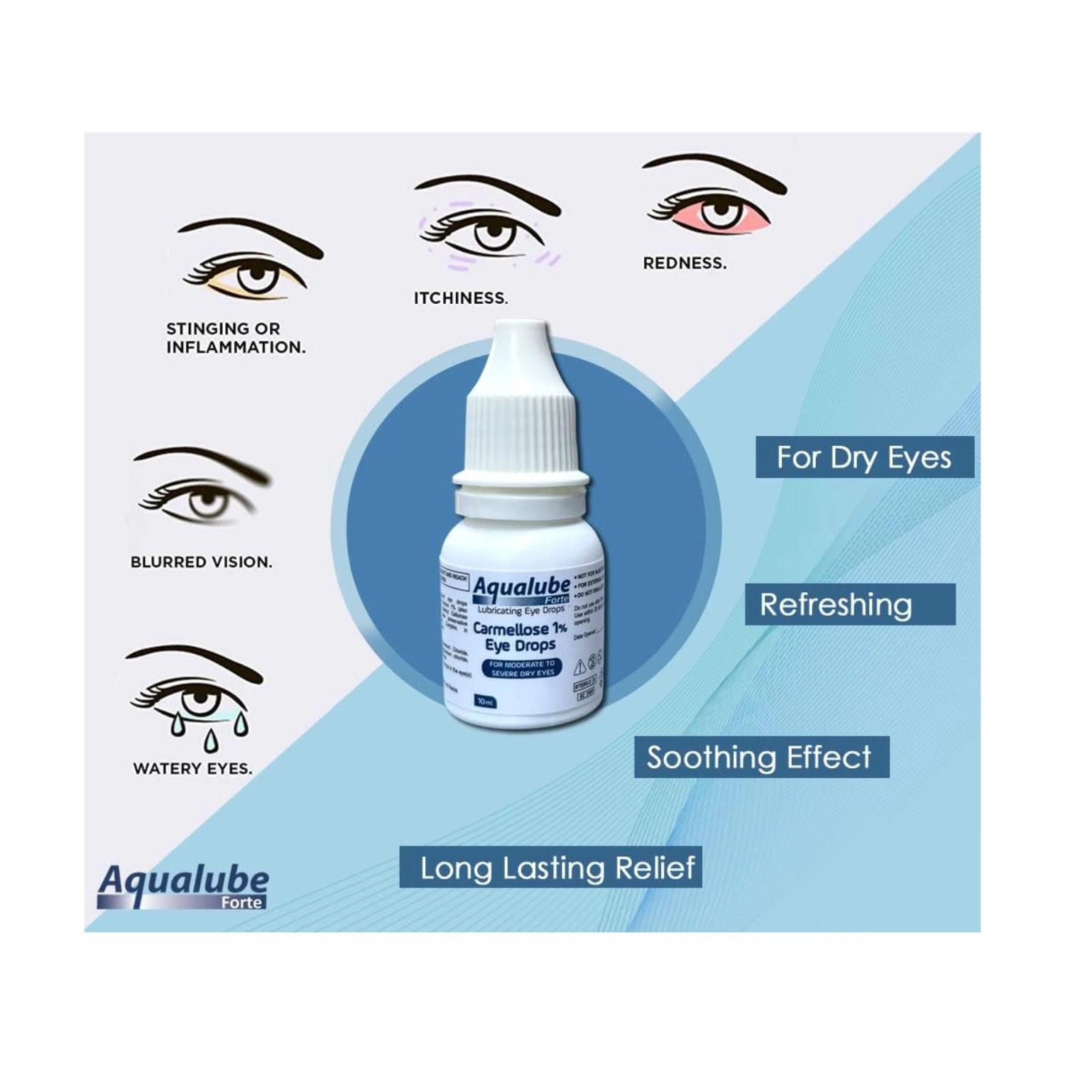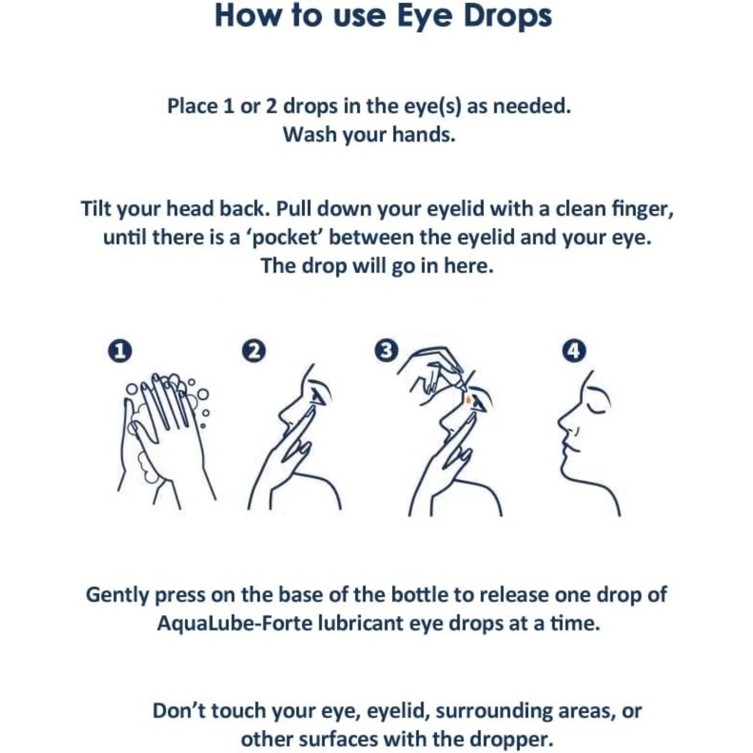 Place 1 or 2 drops in the eye(s) as directed. Tilt your head back. Pull down your eyelid with a finger, until there is a ‘pocket’ between the eyelid and your eye. Bring the bottle tip close to the eye. Use the mirror if it helps. Gently press on the base of the bottle to release one drop of AquaLube Forte lubricant eye drops at a time.