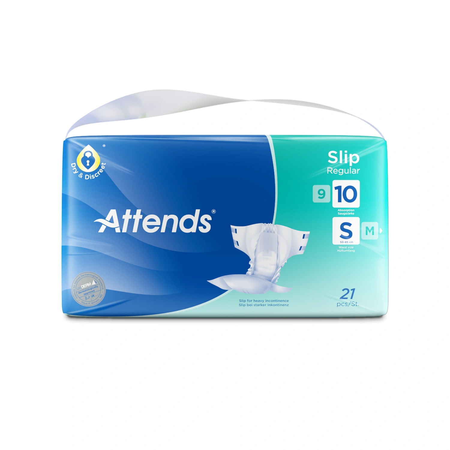 Attends Slip Regular 10 S are all-in-one products designed to manage heavy urinary and/or faecal incontinence. The adjustable tapes are designed to provide a close and comfortable fit to minimise leakages. Feel confident in a secure fit with four adjustable tabs.