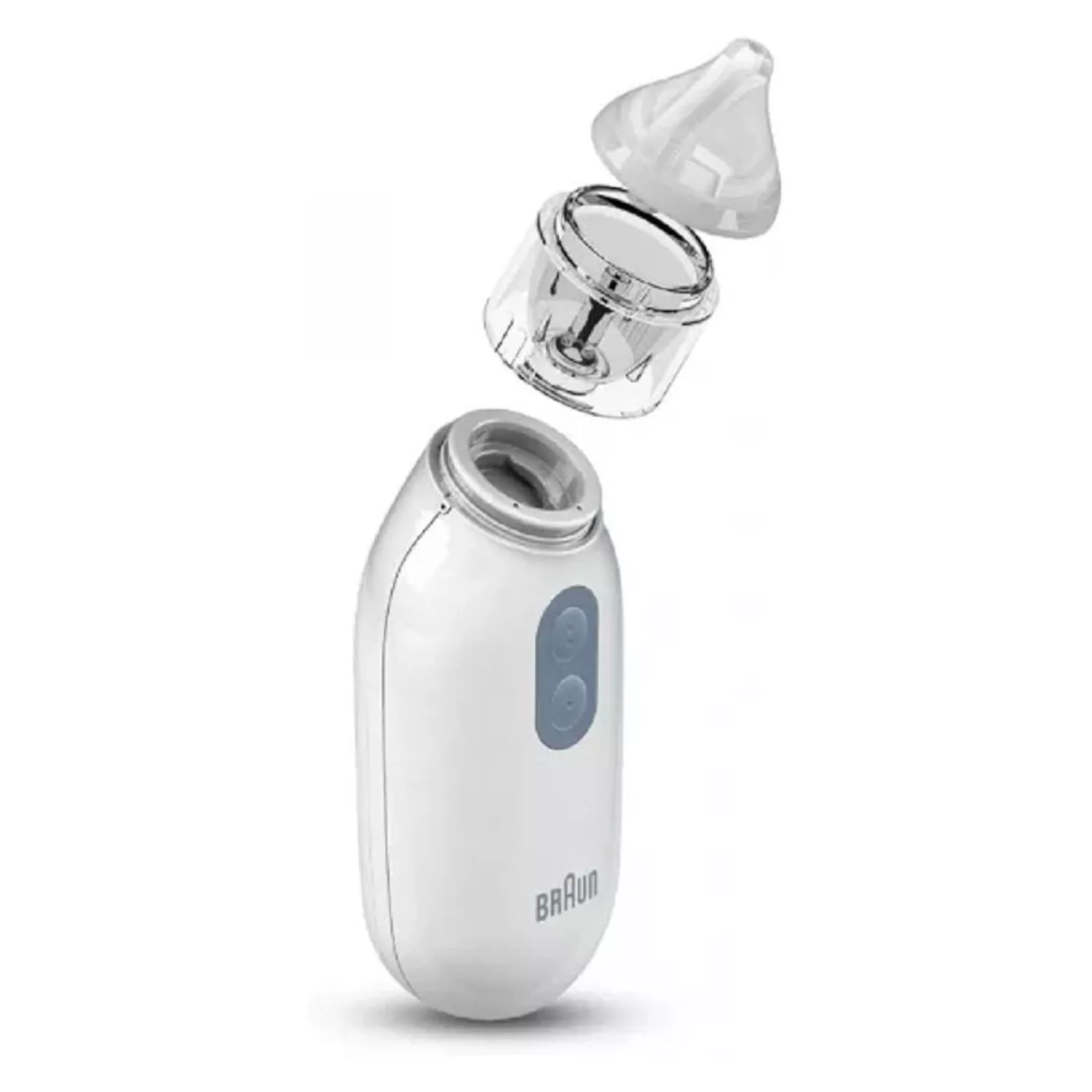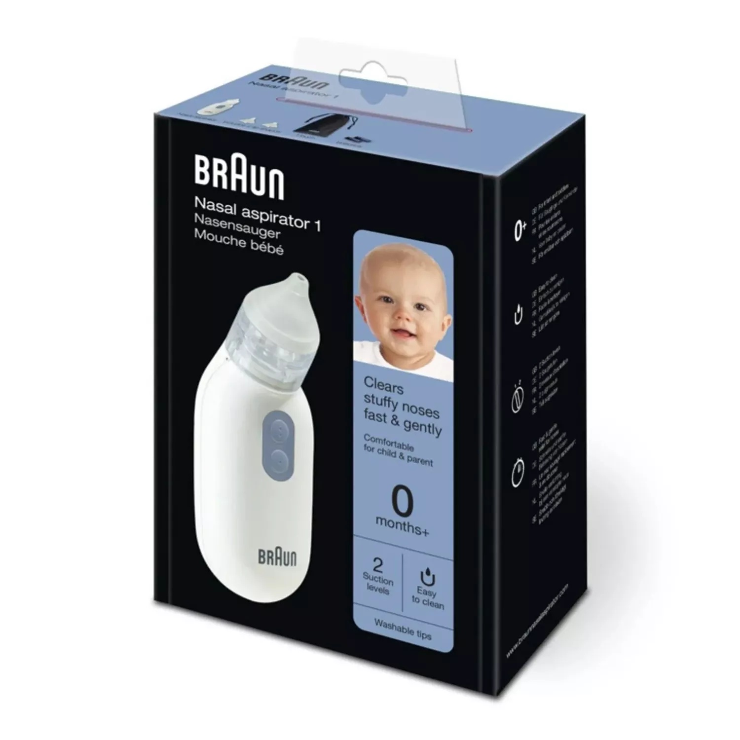 From an established brand that designs products you can trust, Braun Nasal aspirator 1 helps you take control of your child?s congestion. Our electric nasal aspirator features two suction levels?with the lower level specifically made to be gentle on newborns and comes equipped with two nose tips: one for surface level, the other for a better insertion into the nose canal. Choose the tip that fits tight for optimal results. Winner of the Red Dot award for its ergonomic design, it can deliver gentle suction and safely clear away mucus from any angle. A storage pouch and two AA batteries are included. It?s dishwasher safe. Gentle on babies and toddlers. It?s congestion relief made easy.