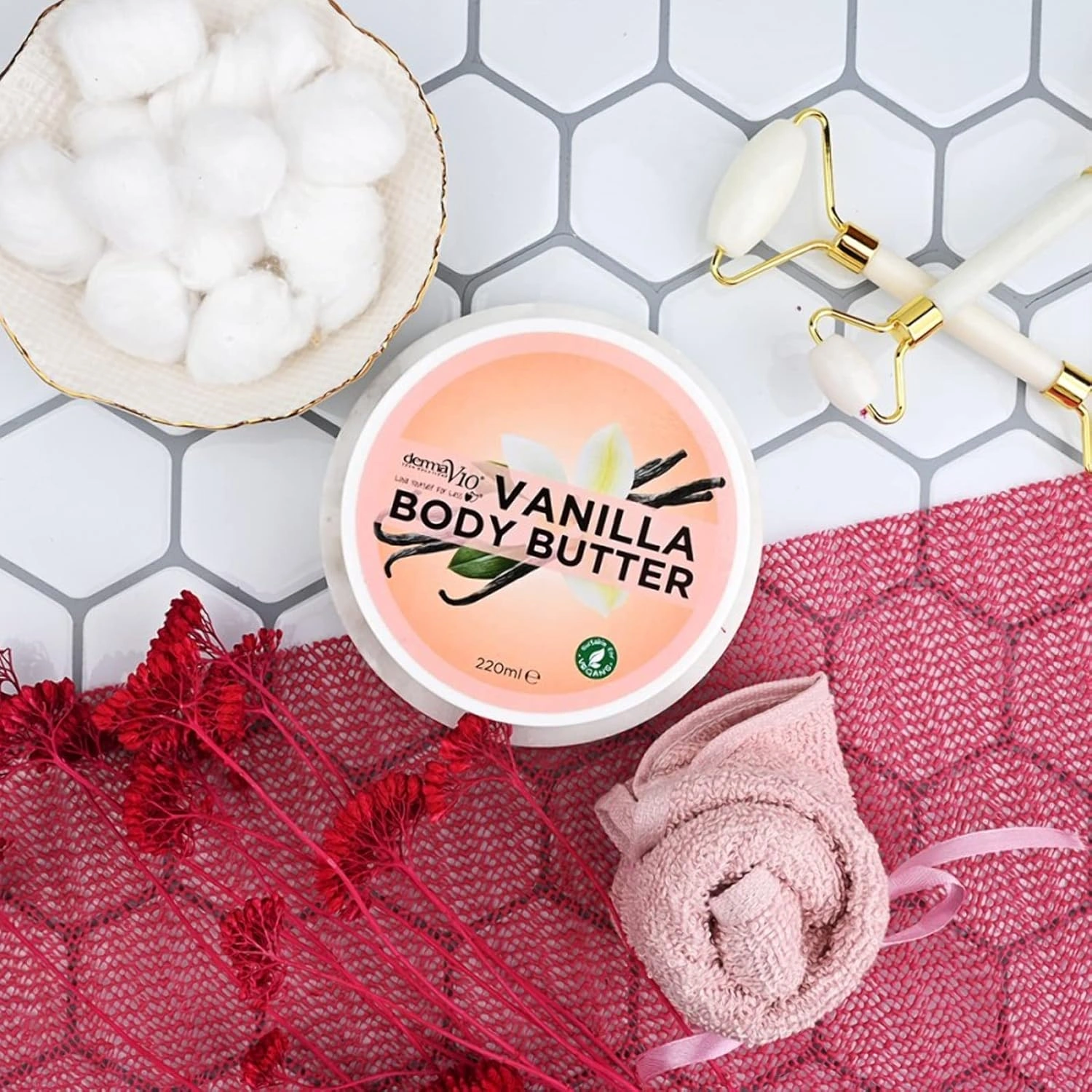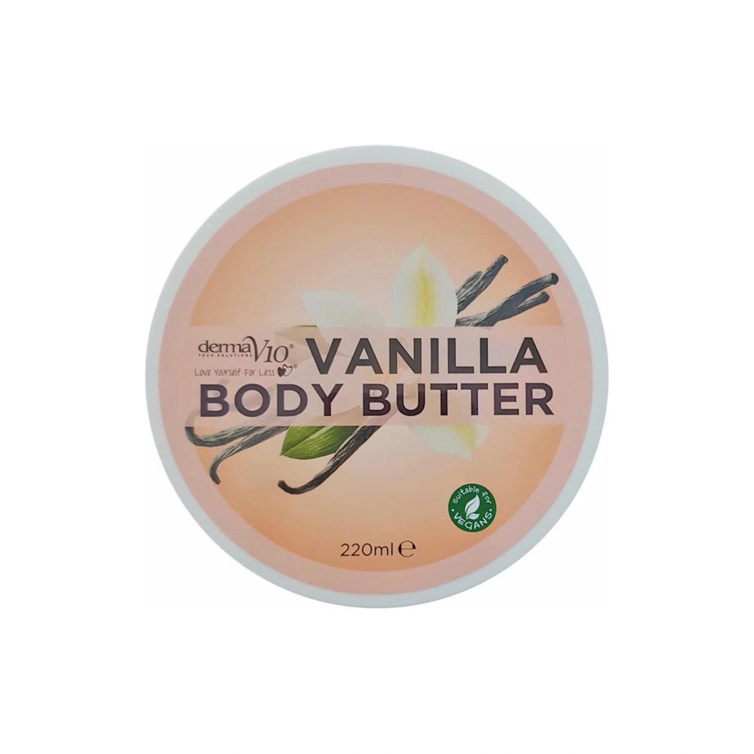 Thick and luxurious, this Vanilla Body Butter will envelop skin in an explosion of intense, invigorating and vibrant vanilla that melts into skin leaving it smooth, hydrated and conditioned. Derma V10 Vanilla Body Butter is formulated for a rich thick texture, suitable for normal to dry skin, leaving your skin feeling nourished and healthy looking. Instant moisturisation leaves your skin feeling soft, smooth and smelling great. Just scoop a generous amount of body butter into your hand, and apply anywhere on the skin, gently rubbing until it is fully soaked in. Vegan friendly.
