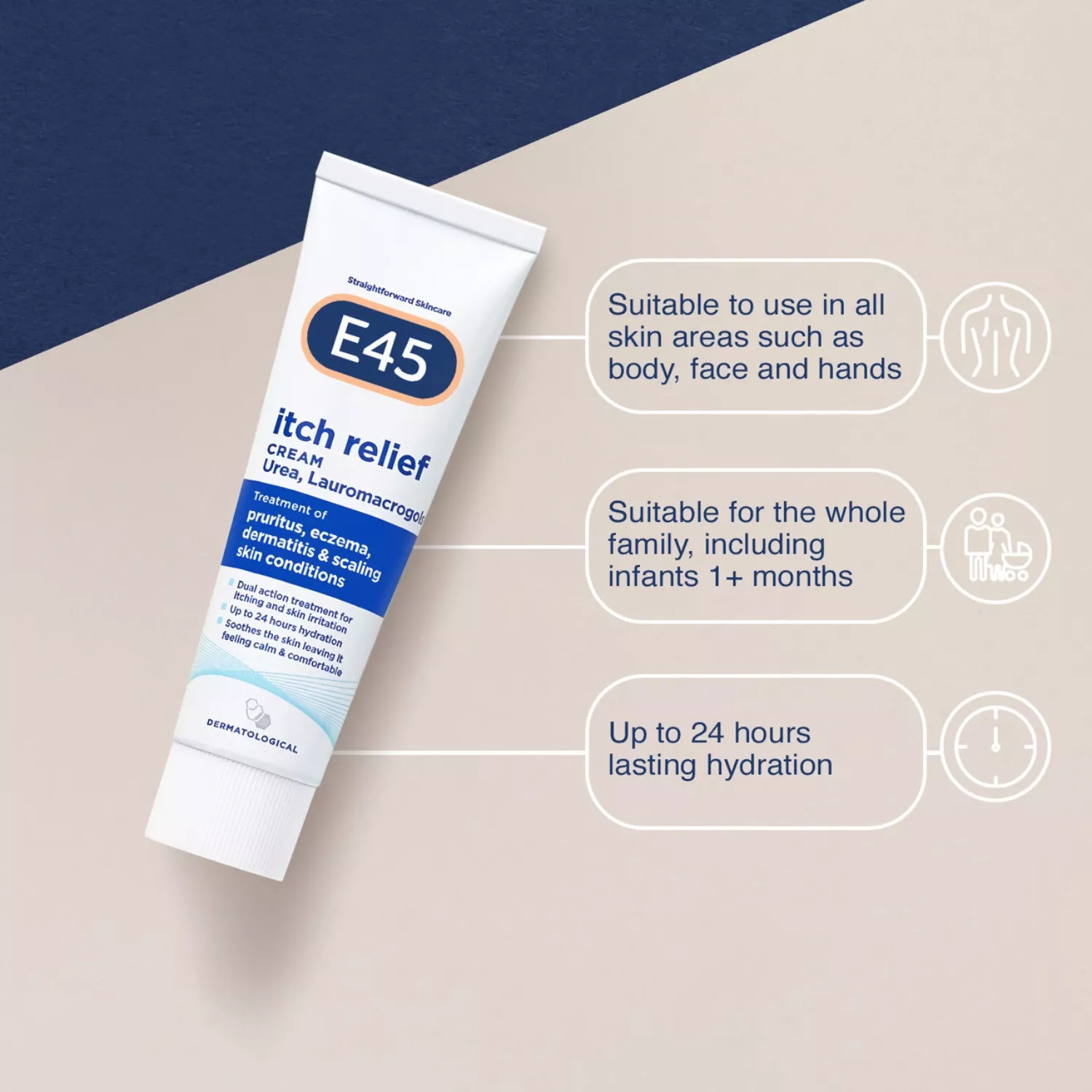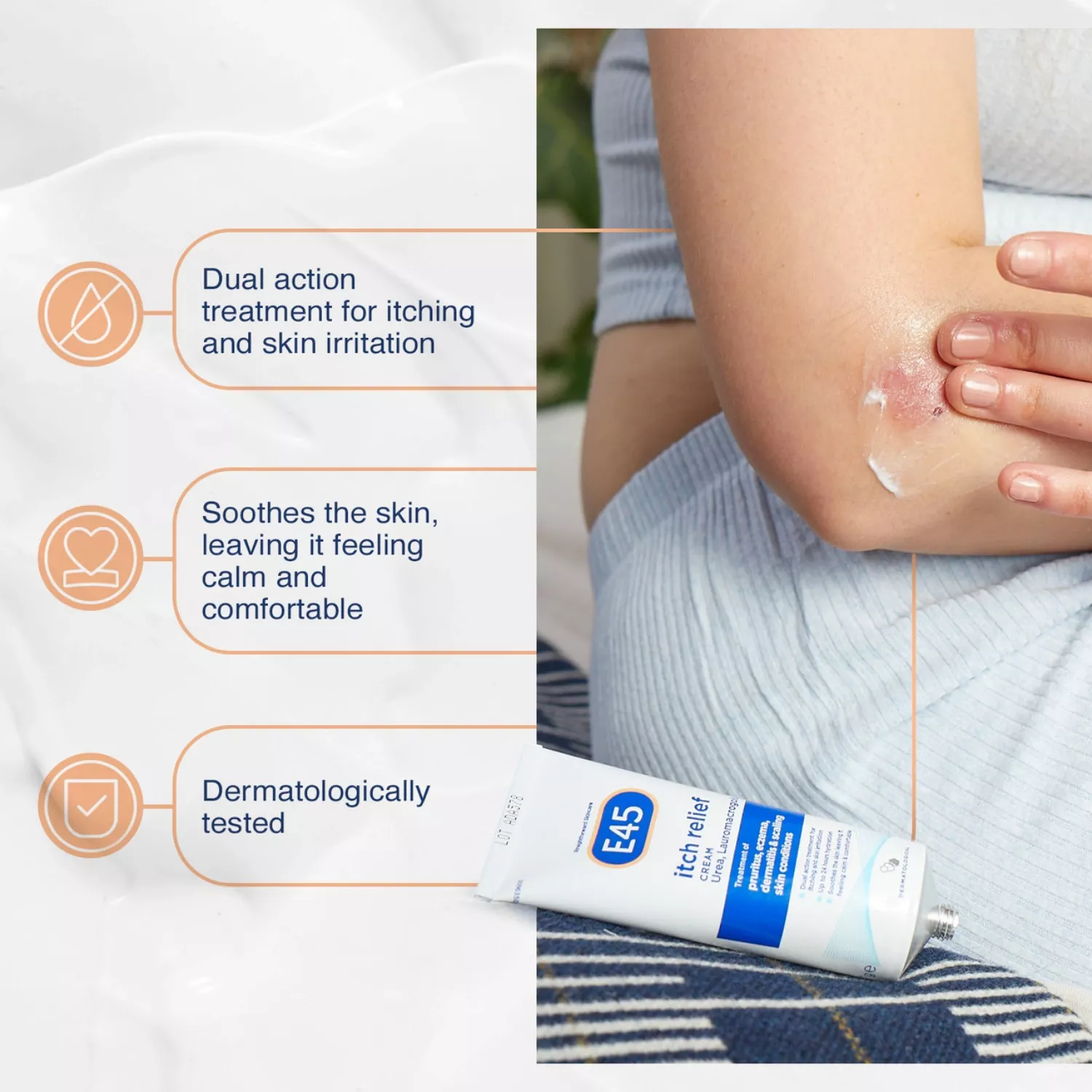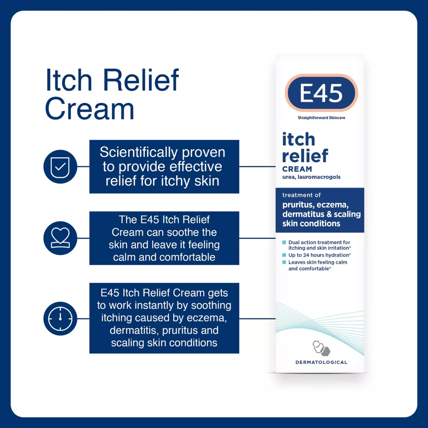 E45 Itch Relief Cream 50g has been crafted as a dual-purpose remedy, aiming to offer swift alleviation from itching and discomfort stemming from dry skin ailments, eczema, dermatitis, pruritus, and flaking skin issues. This moisturising cream, which isn’t oily, is apt for everyone, even infants older than a month. It’s enriched with urea, a naturally occurring skin moisturiser, and lauromacrogols, an anaesthetic for the skin, ensuring that your skin remains serene and at ease.
