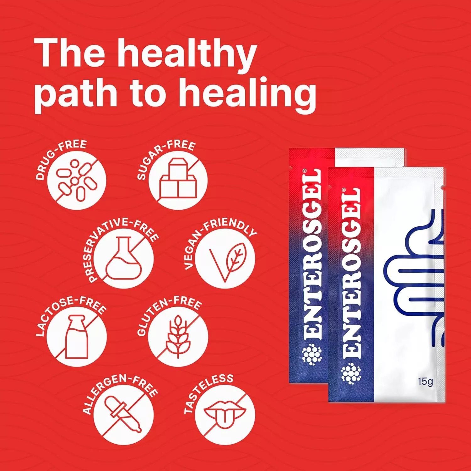 - Enterosgel is free from preservatives, gluten, sugar, sweeteners, lactose, fat, flavours, colouring, and plant or animal-derived ingredients.