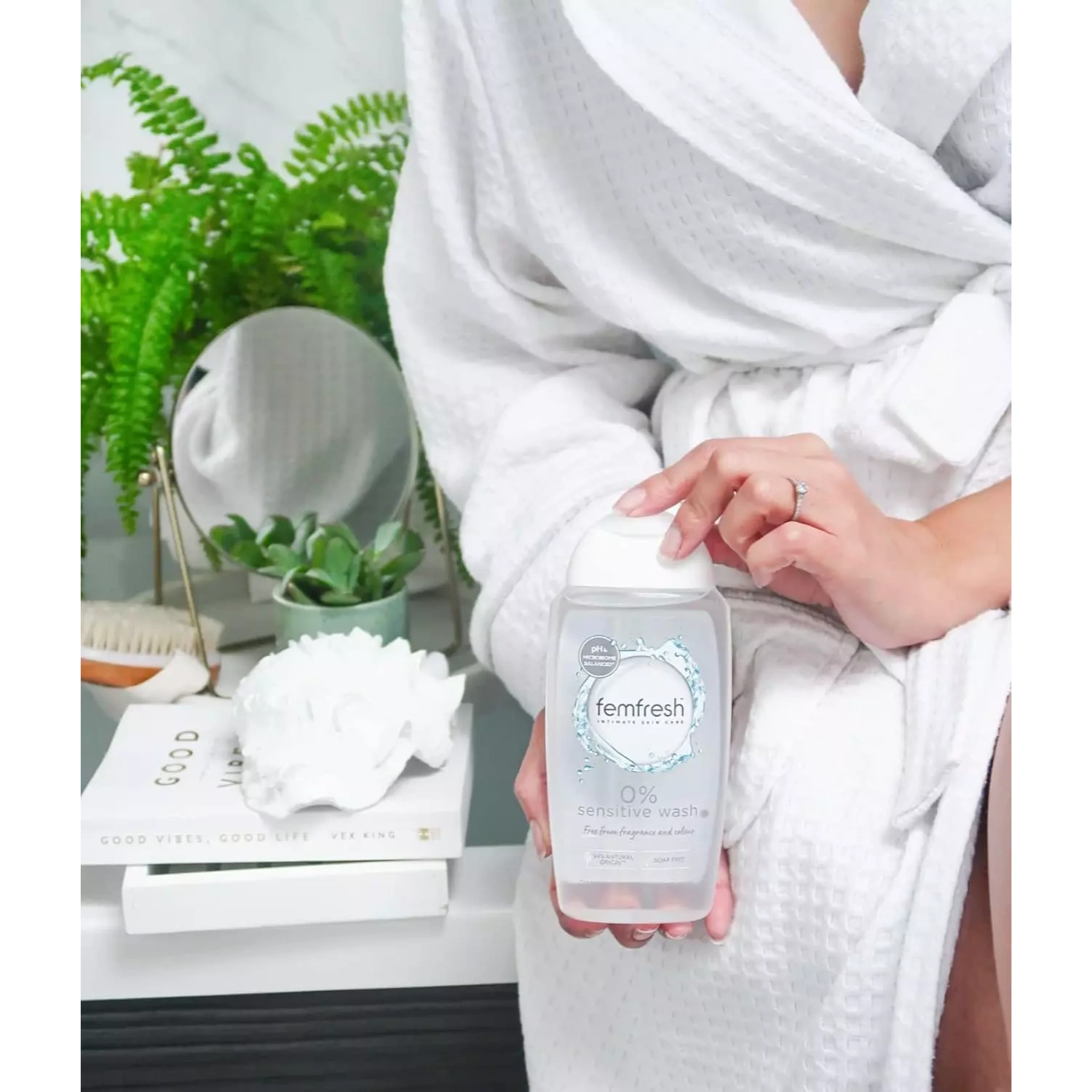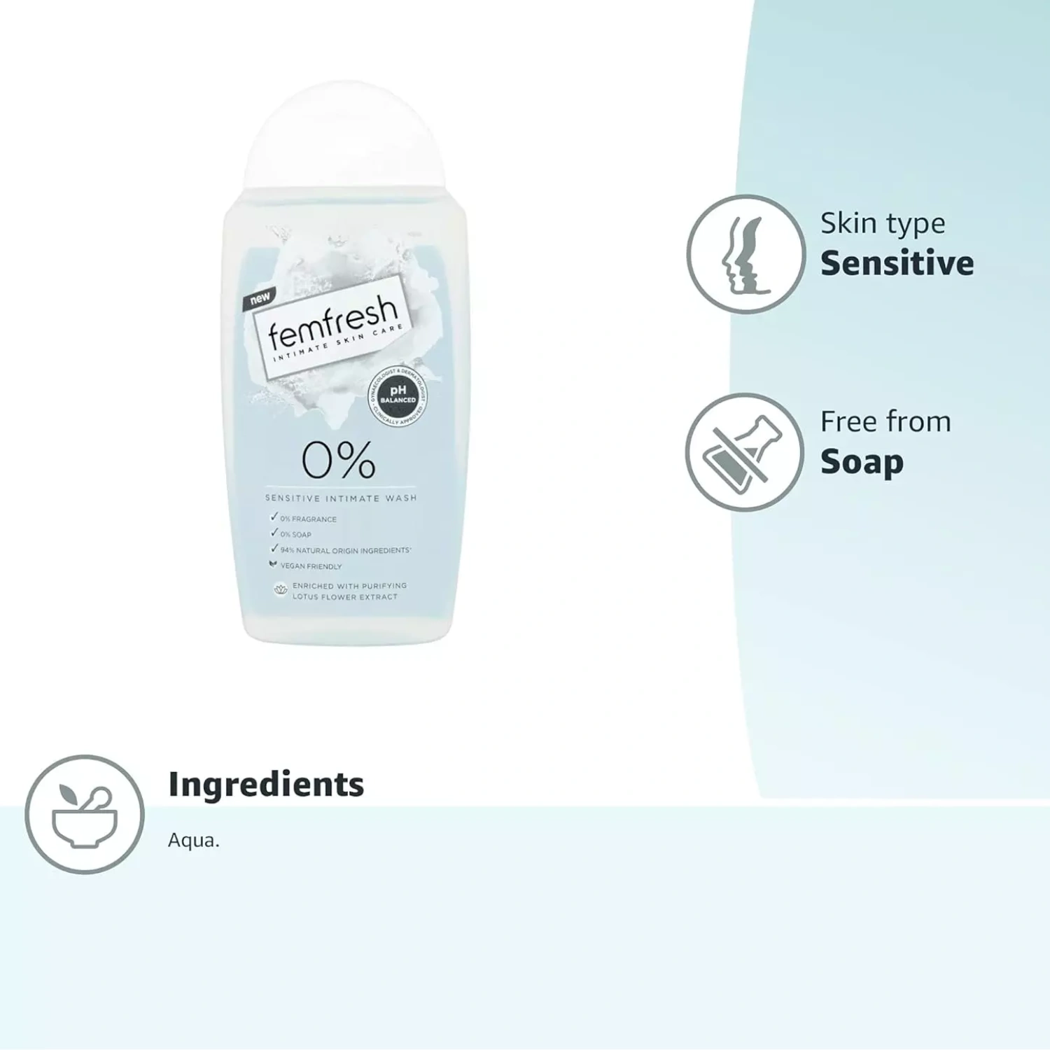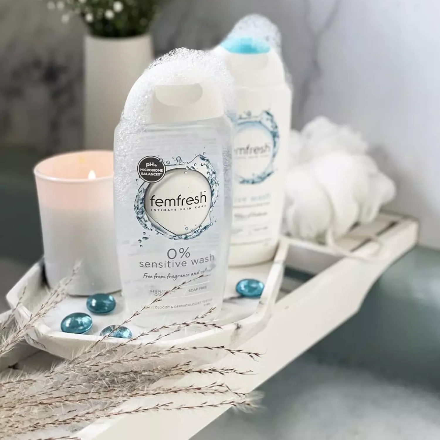 Pamper your intimate skin with the care it deserves using Femfresh 0% Sensitive Intimate Wash, crafted specifically for sensitive skin. Life has plenty of irritations, but your intimate skin won’t be one of them with our gentle 0% Sensitive Wash. This fragrance-free gel wash is composed of 94% natural ingredients, enriched with natural lotus flower extract, to keep your intimate skin feeling happy and fresh. The pH and microbiome balanced formula is both dermatologically and gynaecologically tested. Being 100% soap-free, it’s gentle enough for daily use. For external use only.