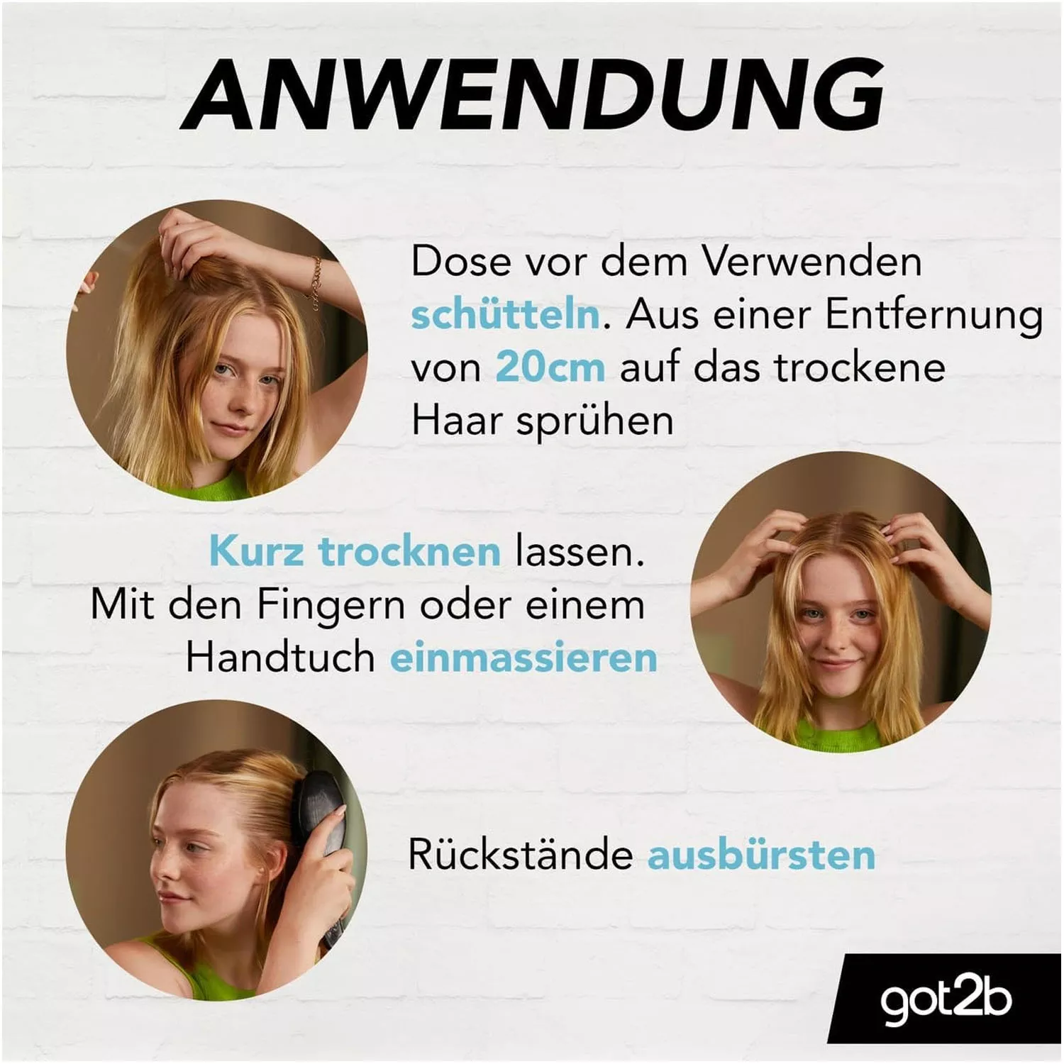 Refresh your style in an instant between washes with got2b Fresh it Up dry shampoo. It quickly cleans & refreshes your hair, giving your hair a lovely fragrance that lasts all day long. This dry shampoo leaves no white residues (after brush out). Top tip: Spray on the hair line at the top and back of the head to remove excess grease.