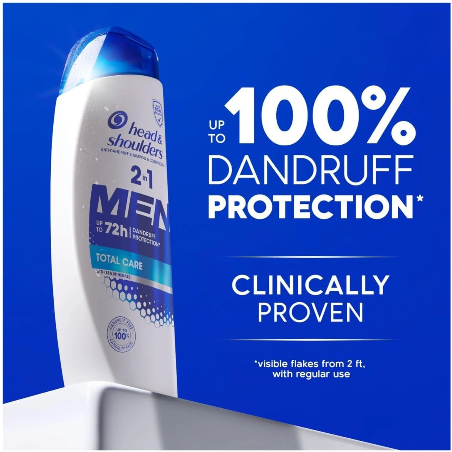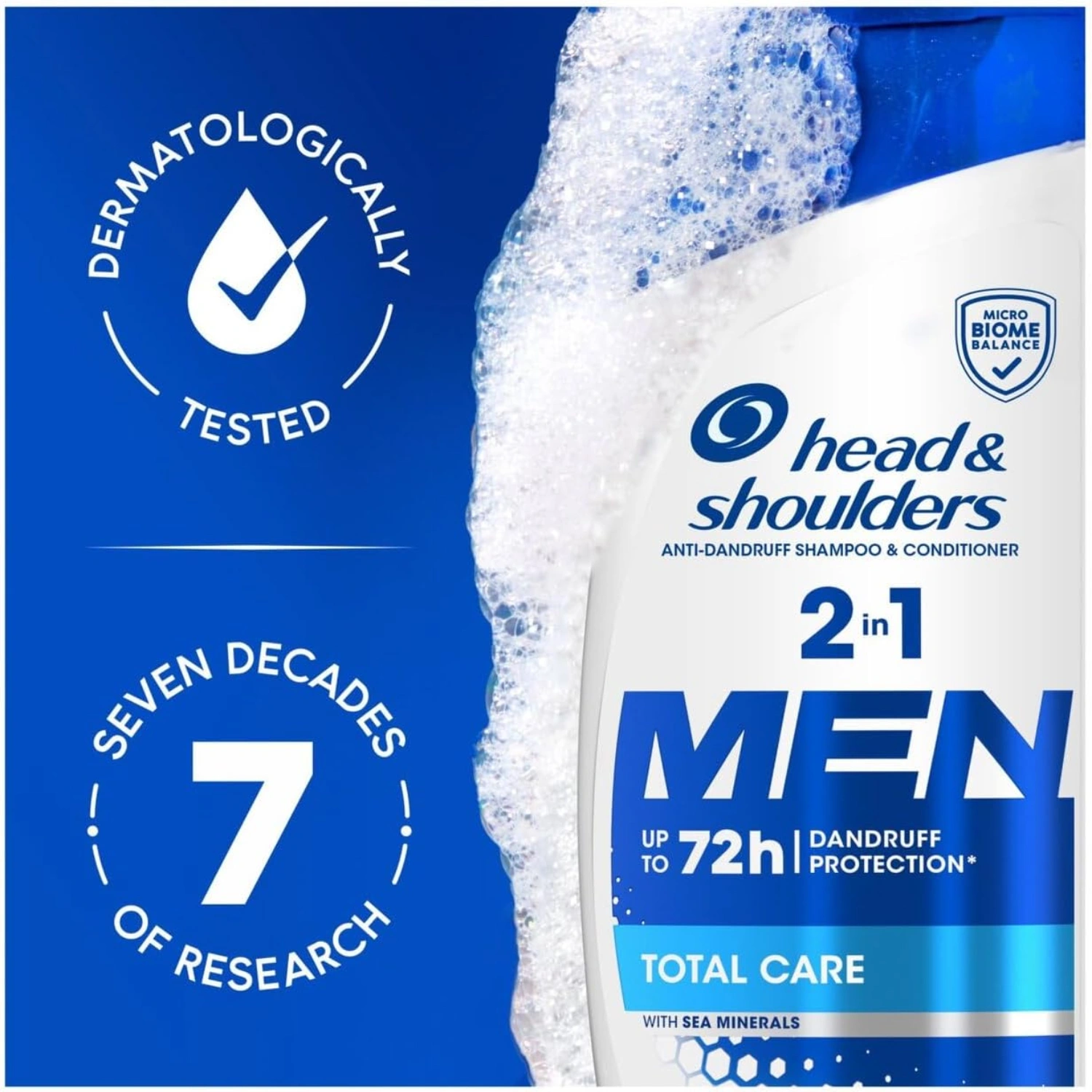 Experience complete scalp and hair care with this innovative 2-in-1 men’s shampoo and conditioner. Enriched with sea minerals, this Total Care formula provides up to 72 hours of dandruff protection while cleansing and conditioning in one convenient step. The advanced Biome Balance technology helps maintain scalp health, targeting the root cause of dandruff for up to 100% flake-free results. Perfect for daily use, this efficient formula saves time in your grooming routine while delivering comprehensive care. The sleek blue and white bottle design features an easy-to-use cap, making it an essential addition to your shower caddy. Whether you’re dealing with occasional flakes or seeking preventive care, this dual-action product offers the convenience of two products in one whilst maintaining your scalp’s natural balance.