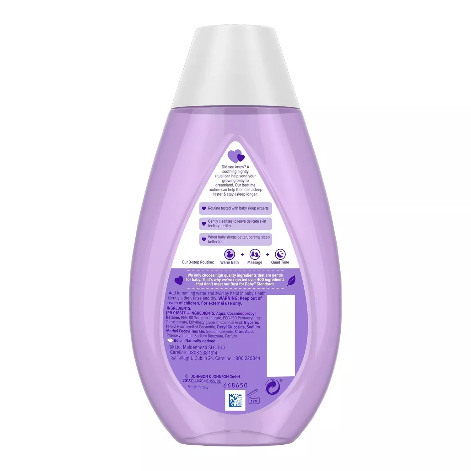 J&J Baby Bedtime Bath Ml Ingredients [PR-013492], Aqua, Coco-Glucoside, Sodium Lauroamphoacetate, Sodium Lauretha Sulfate, Citric Acid, Polysorbate 20, Sodium Chloride, PEG-150 Distearate, PEG-80 Sorbian Laureate, Sodium Benzoate, Parfum Directions To use: Add to running water and swirl by hand in baby’s bath. Gently lather, rinse, dry and snuggle Safety Warning WARNING: Keep out of reach of children. For external use only. Packaging contains small parts which could cause a choking hazard. Box Contains 1 x Bottle of baby bubble bath.