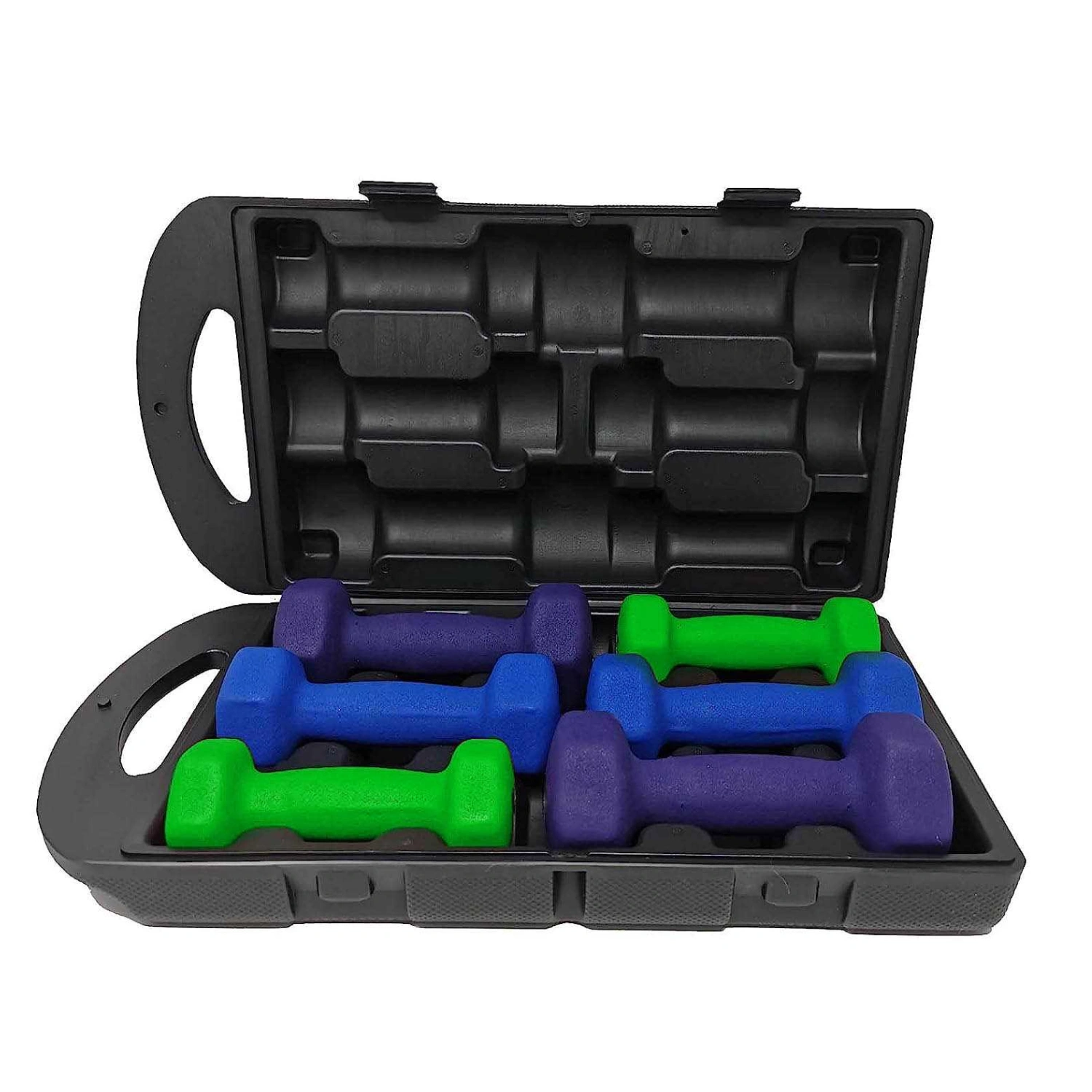 Bring the gym to your home with the Kemket Neoprene Dumbbell Set, designed for comfort, convenience, and performance. This 10kg set includes three pairs of colour-coded dumbbells – Green, Purple, and Blue – neatly packed in a durable carry case for easy storage and portability.