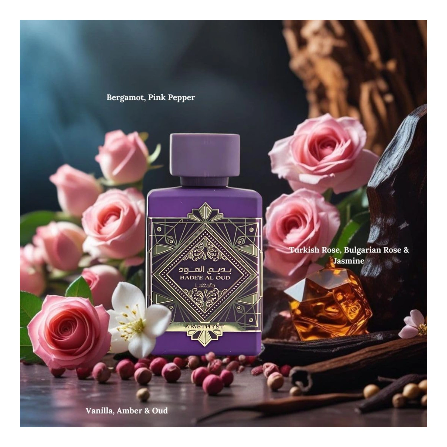 This perfume presents a unique blend of classic spices and florals overlaid the prominent base of sweet vanilla and oud while also offering you the classic notes of rose, jasmine, and bergamot. Perfume Oud For Glory Amethyst – Bade’e Al Oud Amethyst Eau de Parfum by Lattafa Perfumes is a warm fragrance with vanilla, amber and roses. The top note starts with spicy pink pepper and fresh bergamot. The heart note is floral with Turkish roses, Bulgarian roses and jasmine. Oudh, vanilla and amber perfectly round off the perfume in the base. Bade’e Al Oud Amethyst is an exceptionally successful blend of roses, Oudh and warm notes that is very suitable for any occasion. Top Notes: Bergamot & Pink Pepper Heart Note: Turkish Rose, Bulgarian Rose, & Jasmine Base Notes: Vanilla, Amber, & Oud