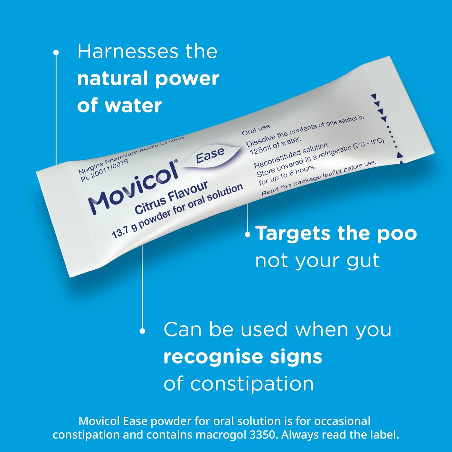 Movicol® Ease is a stool hydrator that contains an active ingredient called macrogol which works by binding with water and drawing it into the stool. The result of this is that the poo becomes softer and easier to pass meaning that your bowel muscles can get back to their natural work of moving the poo along and out of your bowels.