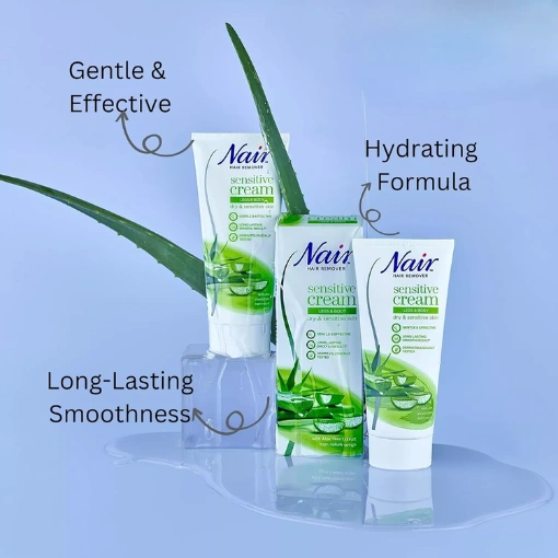 - Nair Hair Removal Sensitive Cream: This formula removes all visible hairs from your legs, under arms and bikini area, for beautifully moisturised, smooth and fuzz-free skin.