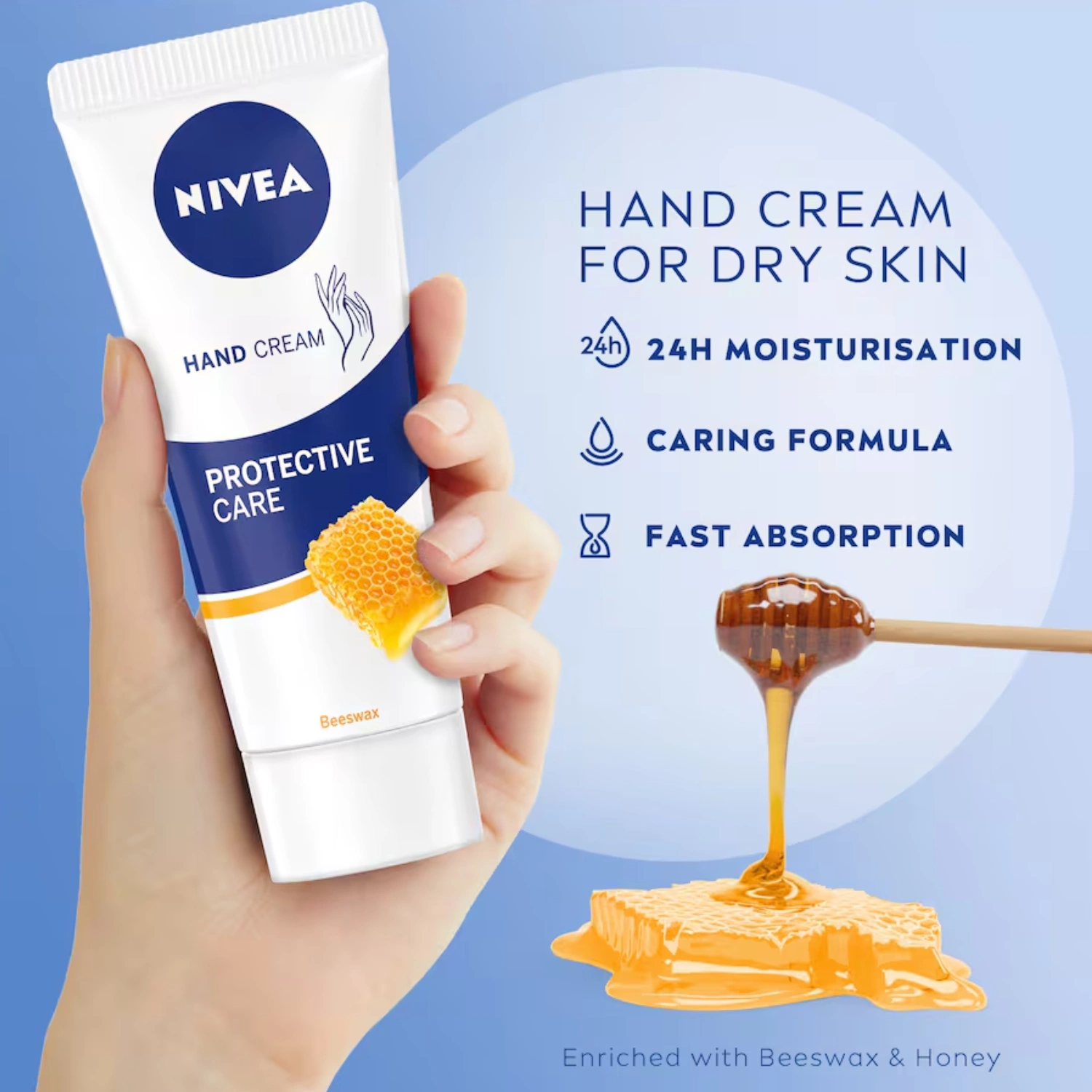 NIVEA Protective Care Beeswax Hand Cream Do you want hydrated hands without a greasy skin feeling? Try NIVEA Protective Care Beeswax Hand Cream: its formula with Beeswax and Honey moisturises your hands and absorbs in seconds, leaving them feeling soft and fresh. This hand cream provides 24 hour care and intensively moisturises dry hands. Product Application: Apply to clean hands at the start of the day and allow the skin to absorb it. Use daily for best results. Massage cream into hands and allow to fully absorb. It is fast absorbing, moisturising and suitable for all skin types. Check ingredients for sensitivities.