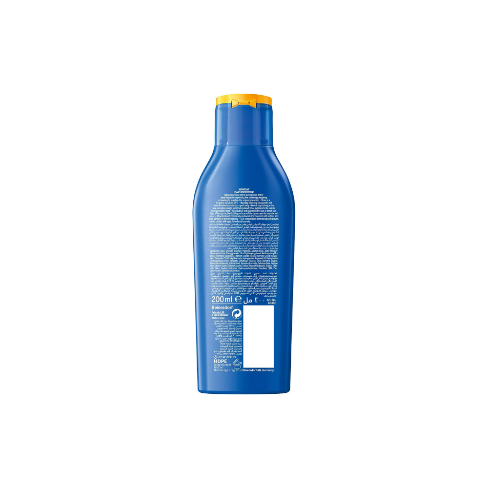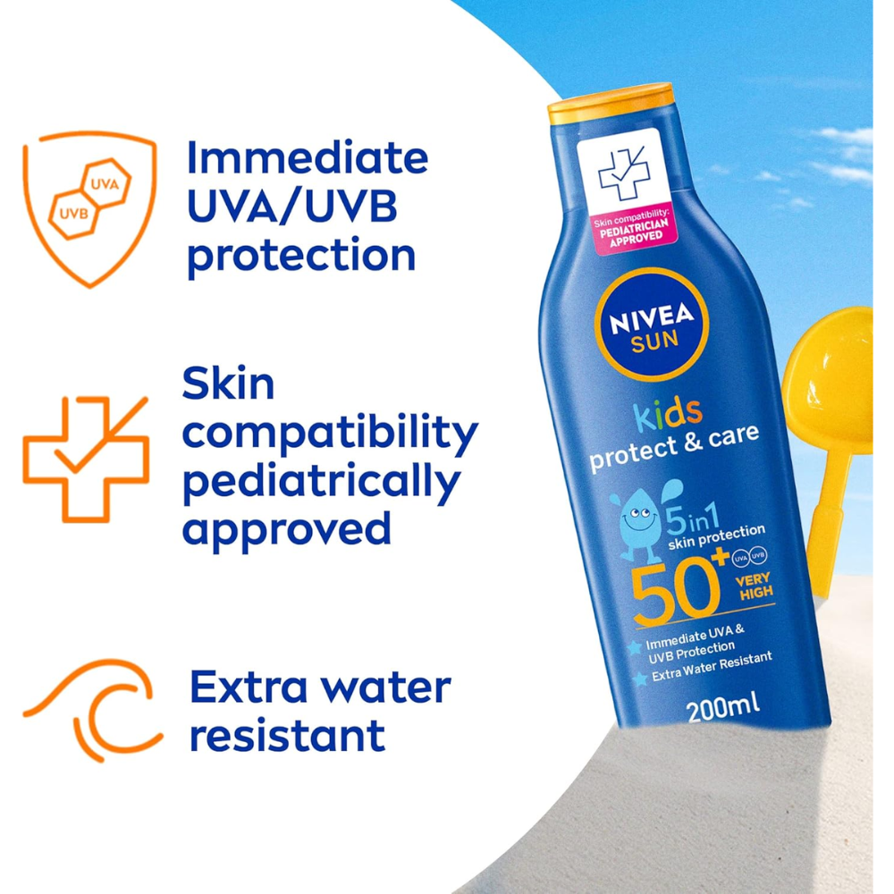 The NIVEA SUN Kids Protect & Care sun cream Lotion SPF50+ 200ml offers immediate UVA & UVB protection. It keeps kids’ delicate skin healthy as it helps to prevent sunburn and long-term UV damages. The product is sweat and extra water resistant to reliably protect active kids during any fun outside moment. The improved formula combines ingredients such as Panthenol, Vitamin E & C and is tailored to kids’ skin needs. It supports the skin’s protective barrier and prevents skin dehydration. Fast absorbing, easy-to-spread lotion formula – for a hassle-free application without sticky hands! The formula respects the ocean by being free of UV filters Octinoxate, Oxybenzone, Octocrylene and free of Microplastic. The NIVEA SUN Kids Protect & Care Lotion SPF50+ 200ml uses 96 % Recycled plastic bottles (without cap & label)