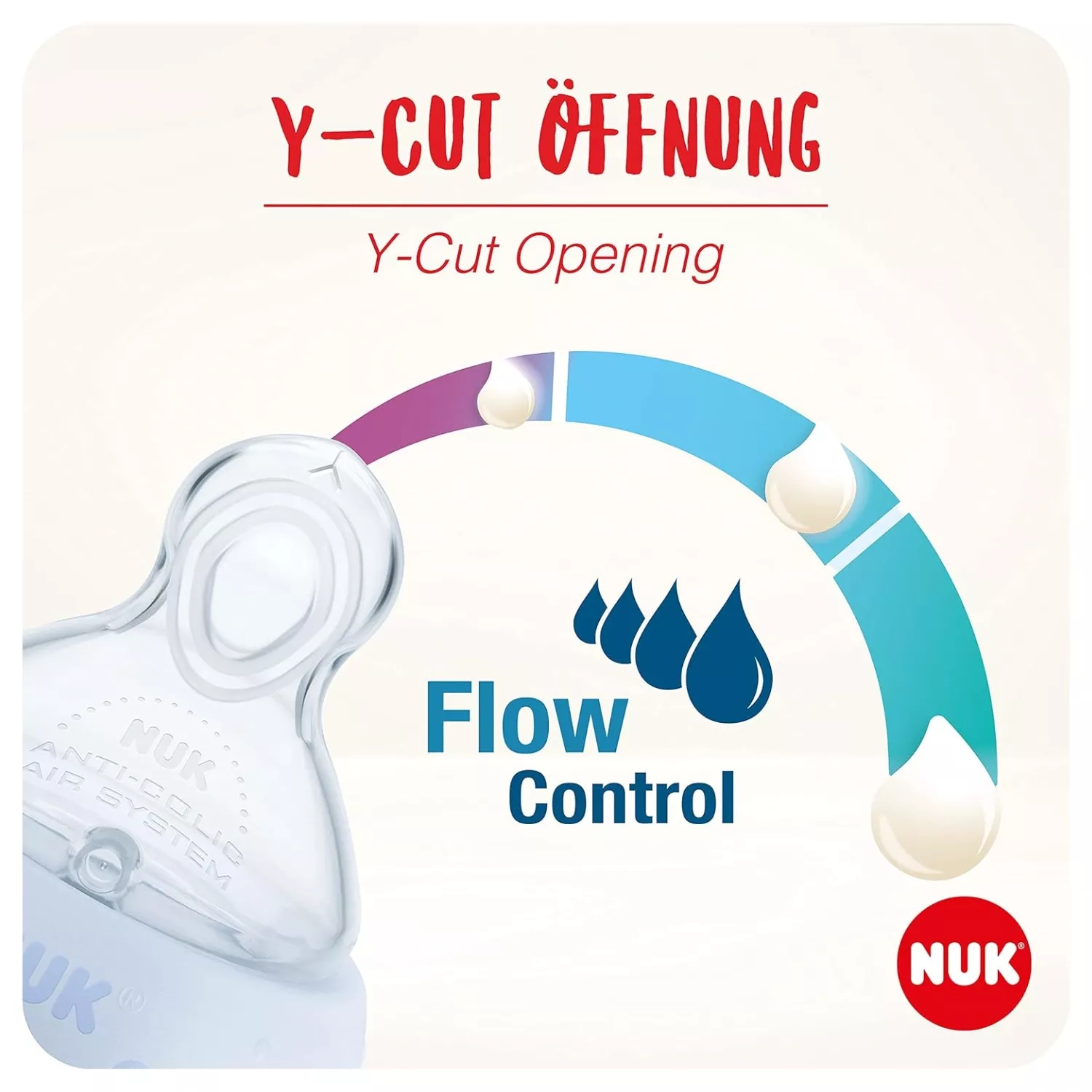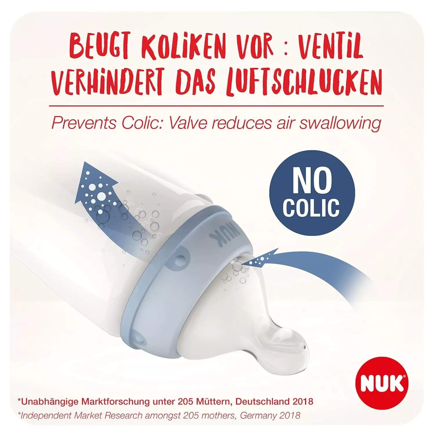 NUK First Choice+ baby bottles have an orthodontic shaped teat and super soft zone which simulates the shape of a mother’s nipple during breastfeeding. This makes it easier for baby to accept and for mum to alternate between breast and bottle-feeding. The built-in Temperature Control indicator changes colour from blue to white when the bottle’s contents are too hot, so you can be sure your baby’s milk is always at a comfortable drinking temperature. The natural shape of the NUK teat also perfectly adapts to baby’s sensitive palate and helps exercise their jaw and teeth, while the NUK Anti-Colic Air System minimises infant colic caused by the harmful swallowing of air. Each bottle is BPA-free and durable, while the included sealing disc ensures leak-proof transportation.
