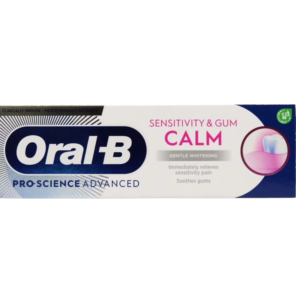 Keep your teeth and gums healthy with the sensitivity and gum calm whitening toothpaste by Oral B. The unique active calm technology of this 75ml toothpaste immediately relieves sensitivity pain by creating a layer of protection and cools gums during and after brushing. The toothpaste is clinically proven to immediately relieve sensitivity pain and soothes gums for a feeling of in-mouth comfort. Thanks to its gentle foam The toothpaste you get intense comfort and natural whiteness of your teeth. It offers everything you need to fight sensitivity problems and sustain good oral health.