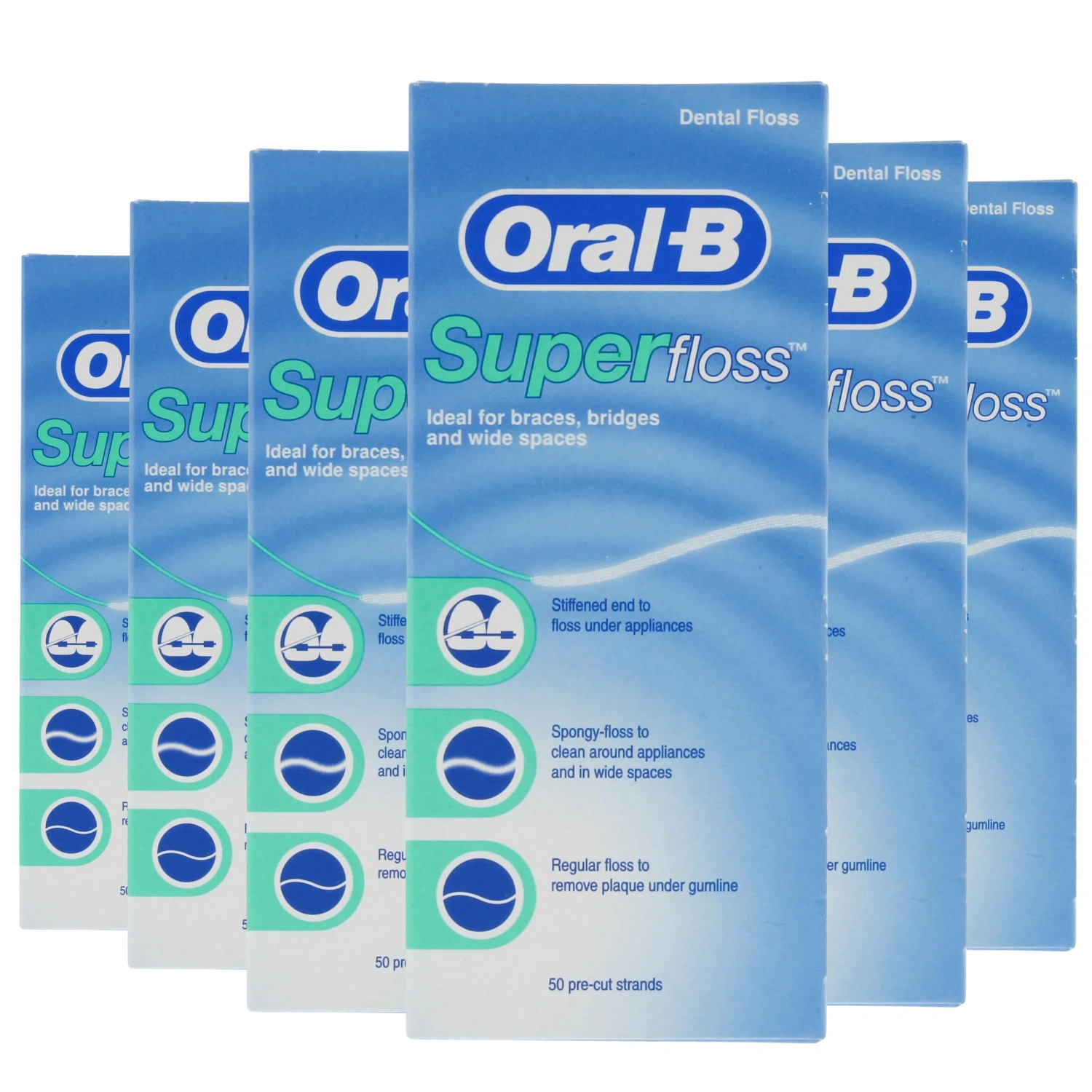 Oral-B Super Floss combines a stiffened end for flossing under appliances, spongy floss for cleaning around appliances and in wide spaces, and regular floss for plaque removal under the gum line.