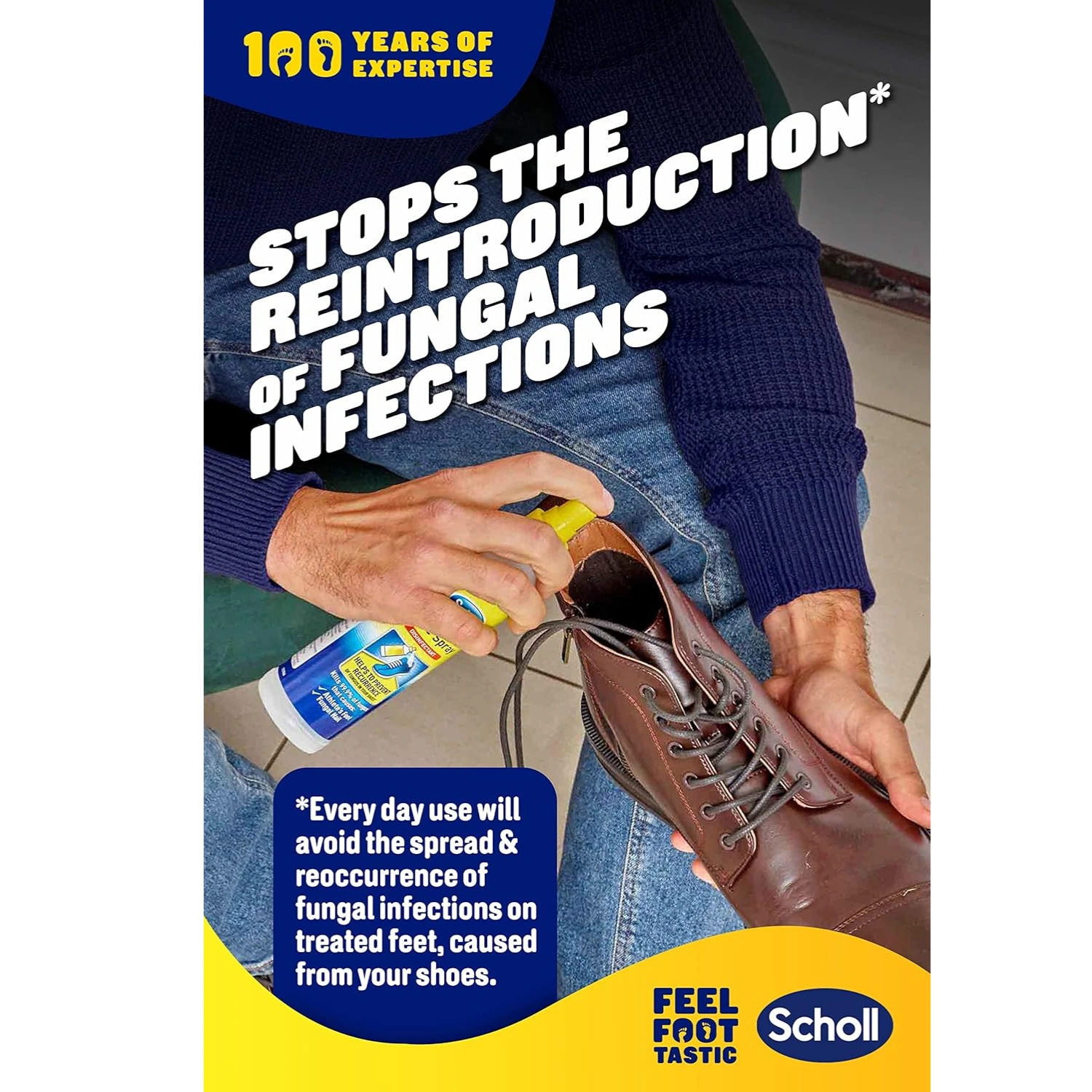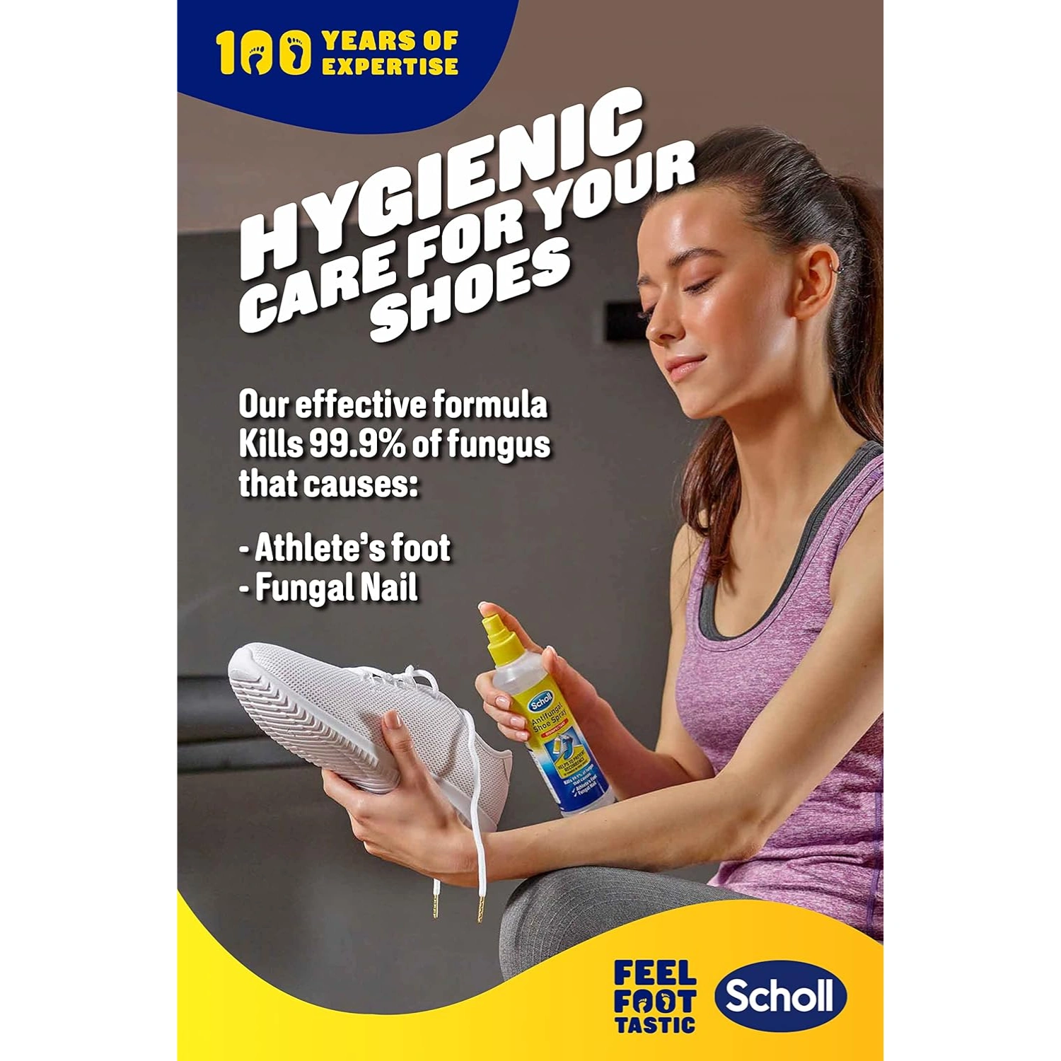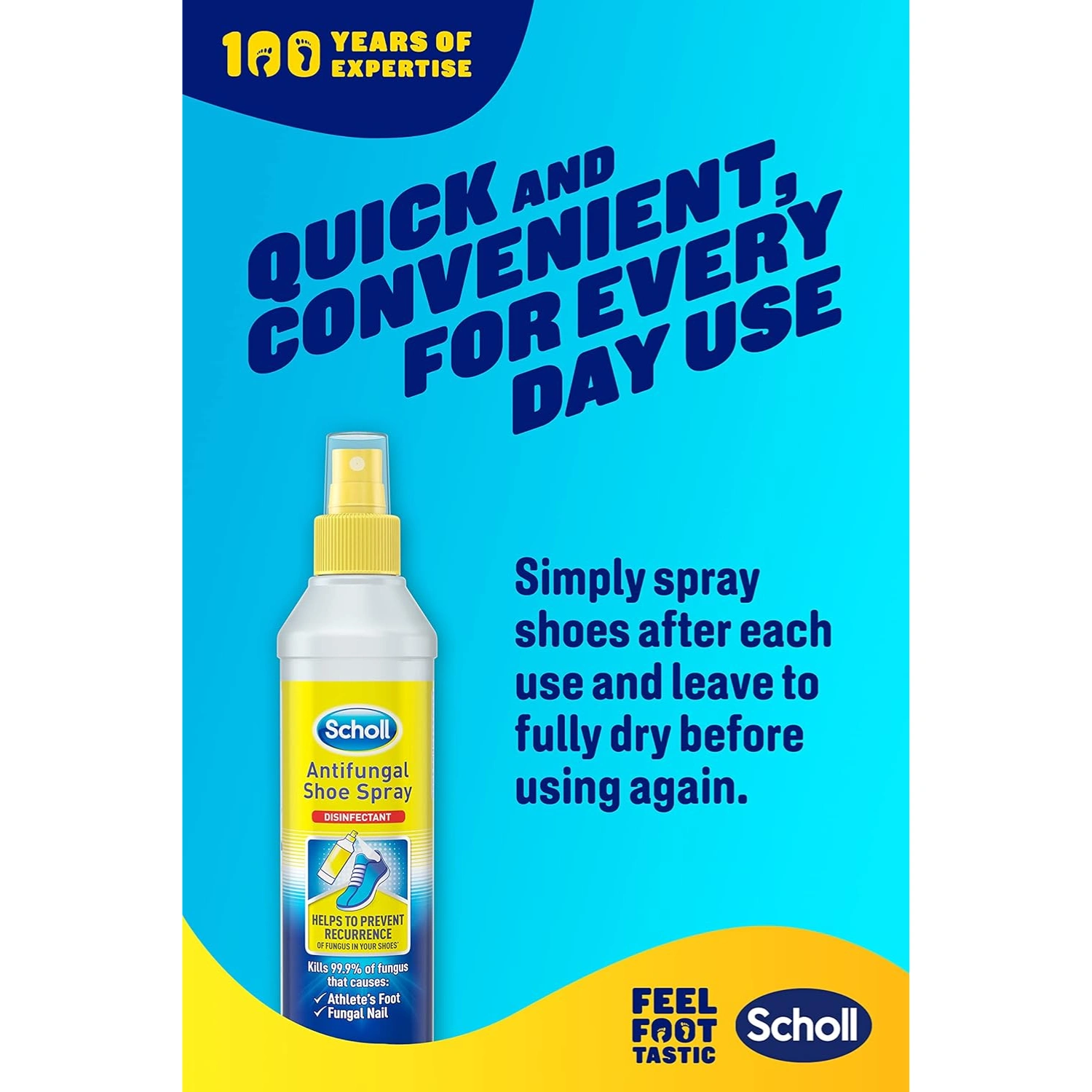 Elevate your foot hygiene with Scholl?s Antifungal Shoe Spray. This powerful 250ml disinfectant spray ensures ultimate freshness by killing 99.9% of fungus associated with common foot issues like Athlete?s Foot and nail infections. Sanitise your shoes in seconds, spraying 2 to 3 times after each use for a fungus-free environment. Use in conjunction with Scholl Athlete?s Foot Cream or Fungal Nail Treatment for comprehensive protection. Step out with confidence and enjoy healthy feet from heel to toe. Make Scholl Antifungal Shoe Spray a daily essential for long-lasting protection against unwanted odours and fungal infections.