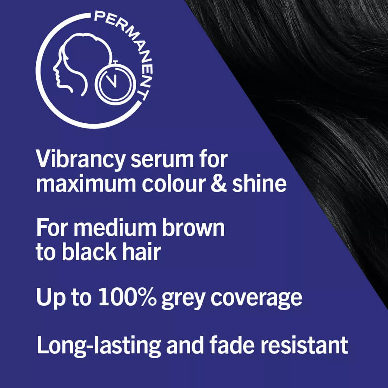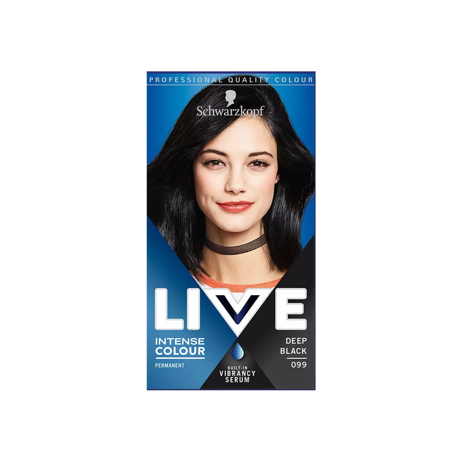 LIVE Intense Colour Deep Black 099 is a permanent vegan formula hair dye designed for medium brown to black hair. Create your own unique look with a vibrant hue of colour and up to 100% grey coverage. The built-in Vibrancy Serum activates colour at the core of each hair strand for maximum colour depth, fade resistance and impressive shine.