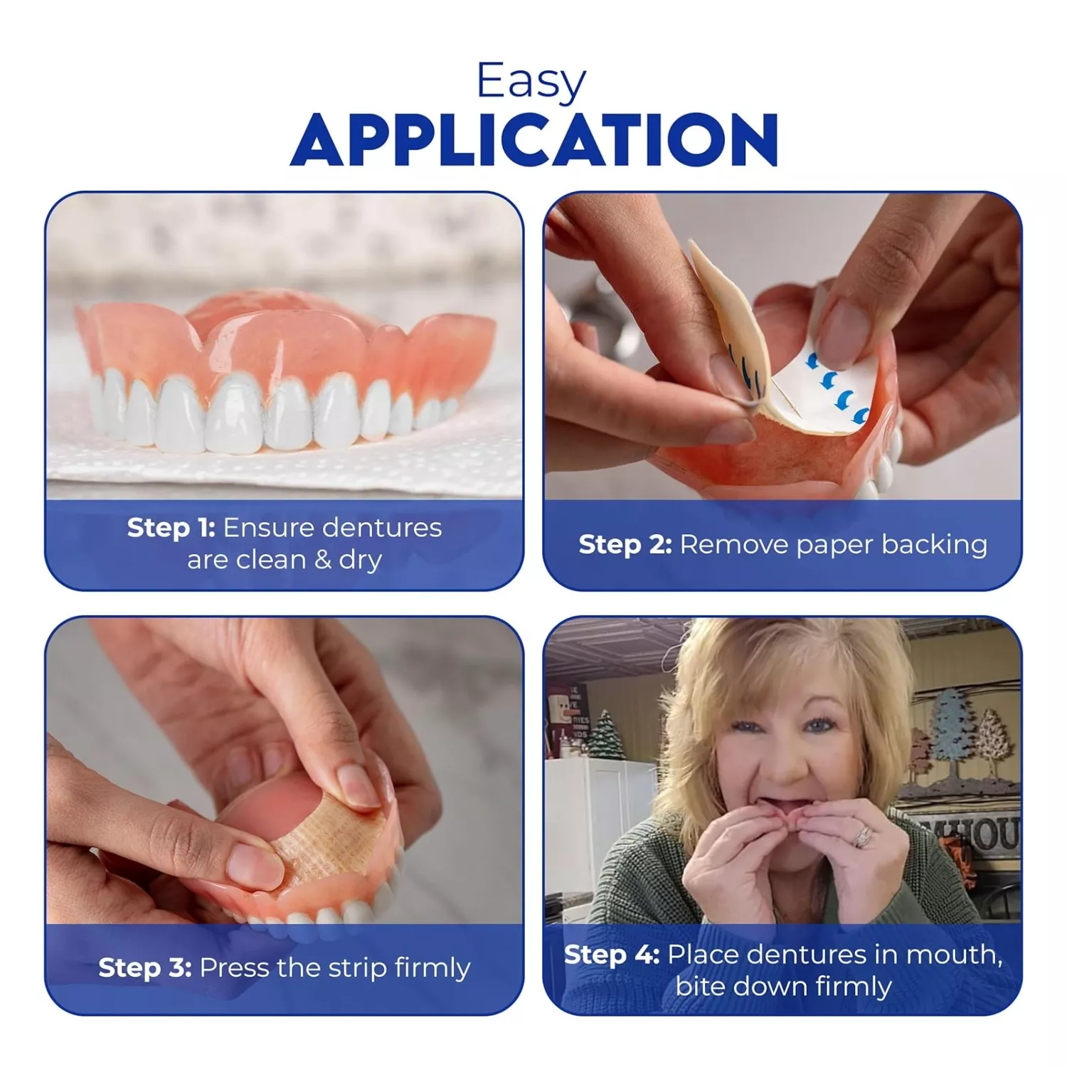 SECURE Denture Strips are actually an adhesive that creates a secure, strong and long lasting bond between the gum and denture. SECURE is insoluble and its effectiveness is not diminished by drink or saliva. SECURE is designed for the more problematic lower dentures, though it is also great for uppers. SECURE does not require saliva to be present in the mouth and is ideal for patients with dry mouth.SECURE is taste free.SECURE is zinc free. SECURE Denture Adhesive Strips provide strong bond between lower dentures and gum for those denture wearers with flat and/or narrow lower gums.It holds lower dentures firmly all day long. Acts like a soft pillow, preventing, tissue irritation, compression sores and inflammation of the oral mucosa.Provides you with the confidence to lead a full and active life.