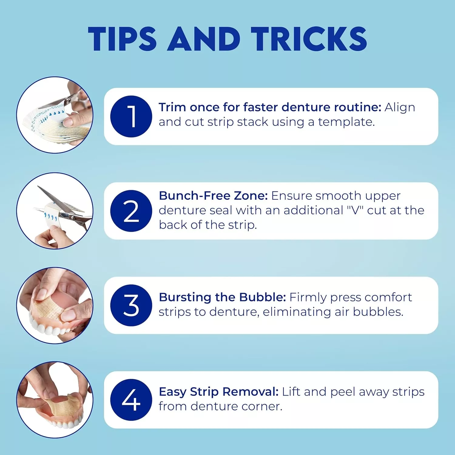 - Clean and dry lower denture thoroughly before applying the Adhesive Strips.