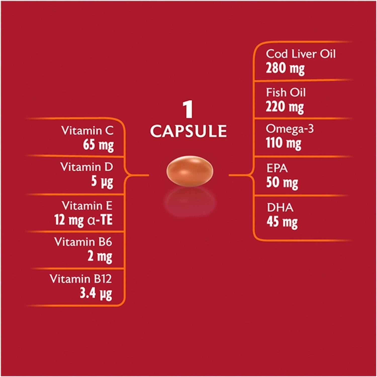 Cod Liver Oil (Fish) (28%), Capsule Shell (Gelatine, Firming Agent: Glycerol, Colours: Beta carotene, sulphite ammonia caramel), Fish Oil (22%), Calcium Ascorbate, Stabiliser: Mono- and Diglycerides of Fatty Acids, Emulsifier: Lecithins (Soya); Vitamin E, Niacinamide, Vitamin B12 Prep. Acidity Regulators (Trisodium Citrate, Citric Acid), Vitamin B12), Vitamin B6, Vitamin B1, Vitamin B2, Vitamin A Prep. (Vitamin A Palmitate, Antioxidant: DL Alpha Tocopherol), Folic Acid, Vitamin D Prep. (Fractionated Vegetable Oil, Vitamin D, Antioxidant: DL Alpha Tocopherol), Vitamin K, Biotin.