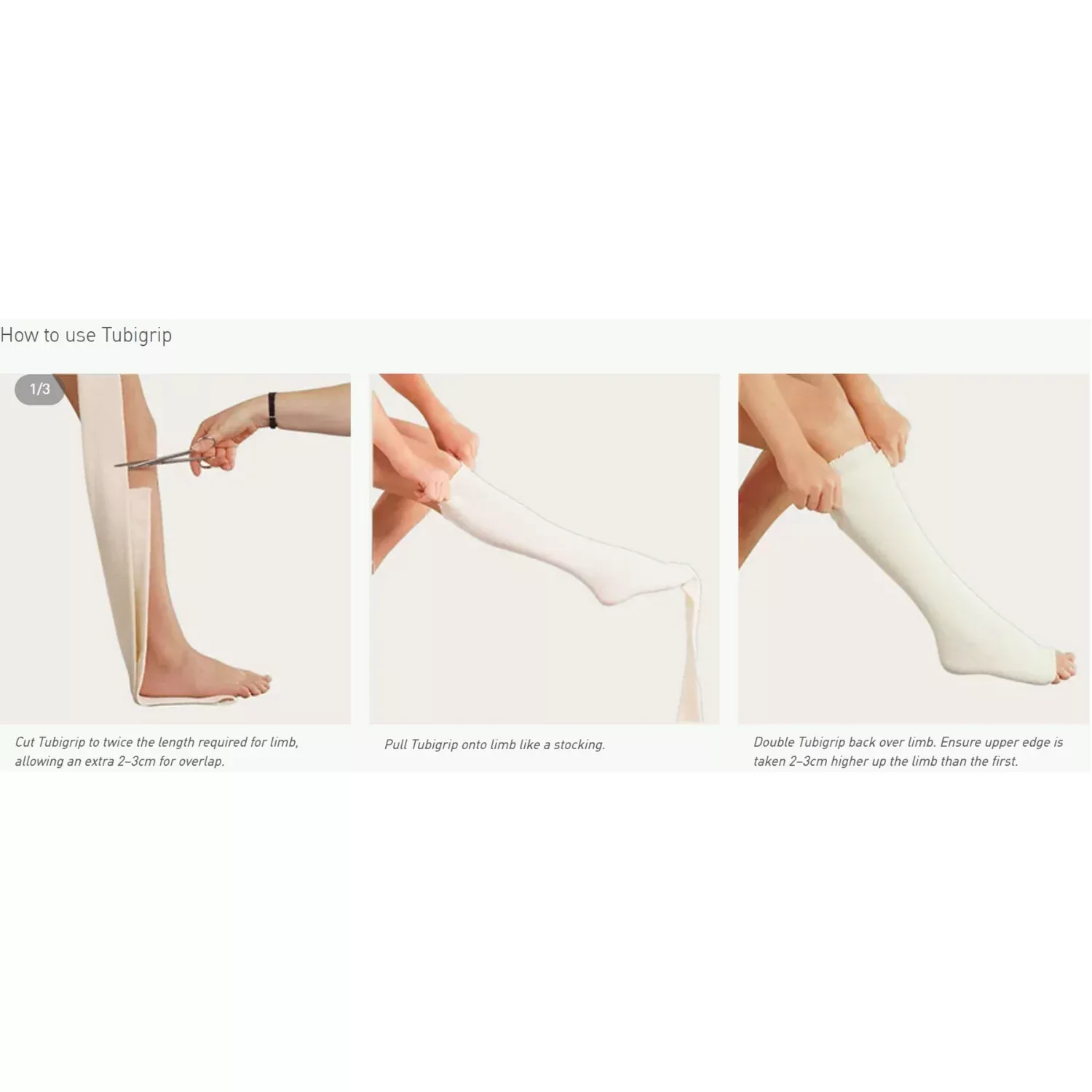 Tubigrip can be positioned without pins or tape. As it can be washed and reused, Tubigrip is particularly useful for outpatients and in the community. Tubigrip is cost-effective, as only the required amount is cut from the roll.