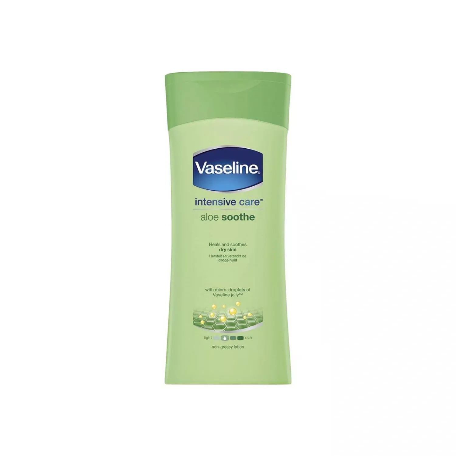 Vaseline Intensive Care Aloe Soothe Body Lotion combines healing micro-droplets of Vaseline Jelly with aloe vera, known to calm and soothe the skin. The result is a refreshing, fast-absorbing lotion that reduces the discomfort associated with dry, irritated skin, and leaves it feeling deeply moisturised and rejuvenated. Our Intensive Care Aloe Soothe Body Lotion is clinically proven to moisturise deeply* to soothe dry skin with the first application, and to keep it restored for 3 weeks**. Our skin is the barrier between our bodies and the outside world, and the health of our skin is essential to our overall well-being. At Vaseline, we believe that healthy skin starts with deep-restoring moisture, which is why our lotion’s formula works to heal and soothe dry skin. The micro-droplets of Vaseline Jelly penetrate deep down within the stratum corneum to lock in moisture and form a protective layer on your skin. This sealing barrier speeds up the skin?s natural recovery process. Apply Vaseline Intensive Care Aloe Soothe Body Lotion daily, letting its rich yet quick-absorbing formula provide intense moisturisation to your skin and leave it delicately fragranced with a fresh aloe vera scent. *based on 4-week treatment clinical study **within the stratum corneum