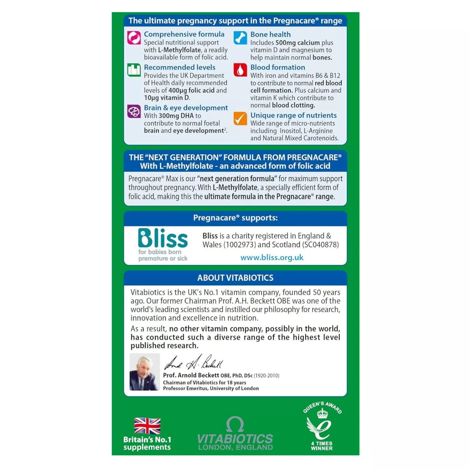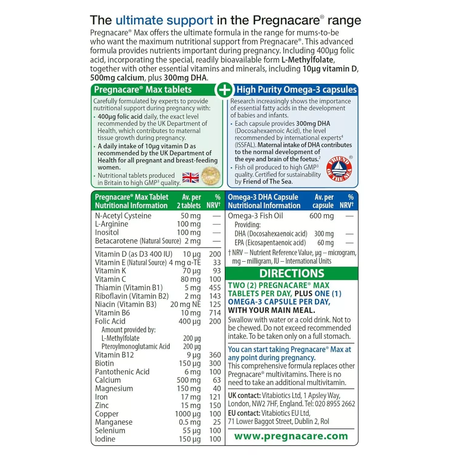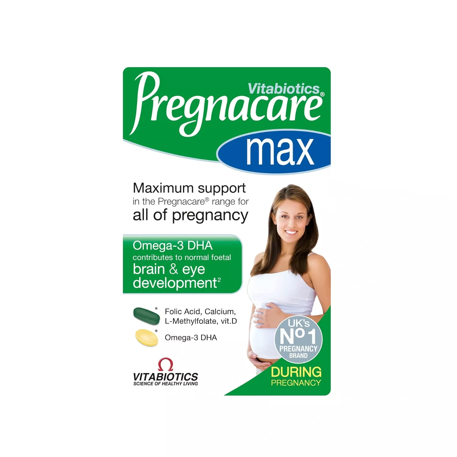 Pregnacare Max offers the ultimate formula in the range for mums-to-be who want the maximum nutritional support from Pregnacare. This advanced formula helps to safeguard daily intake of nutrients important during pregnancy. It provides 400ug folic acid, incorporating the special, readily bioavailable form L-Methylfolate, together with other essential vitamins and minerals, including 10ug Vitamin D, 500mg Calcium, plus 300mg DHA.