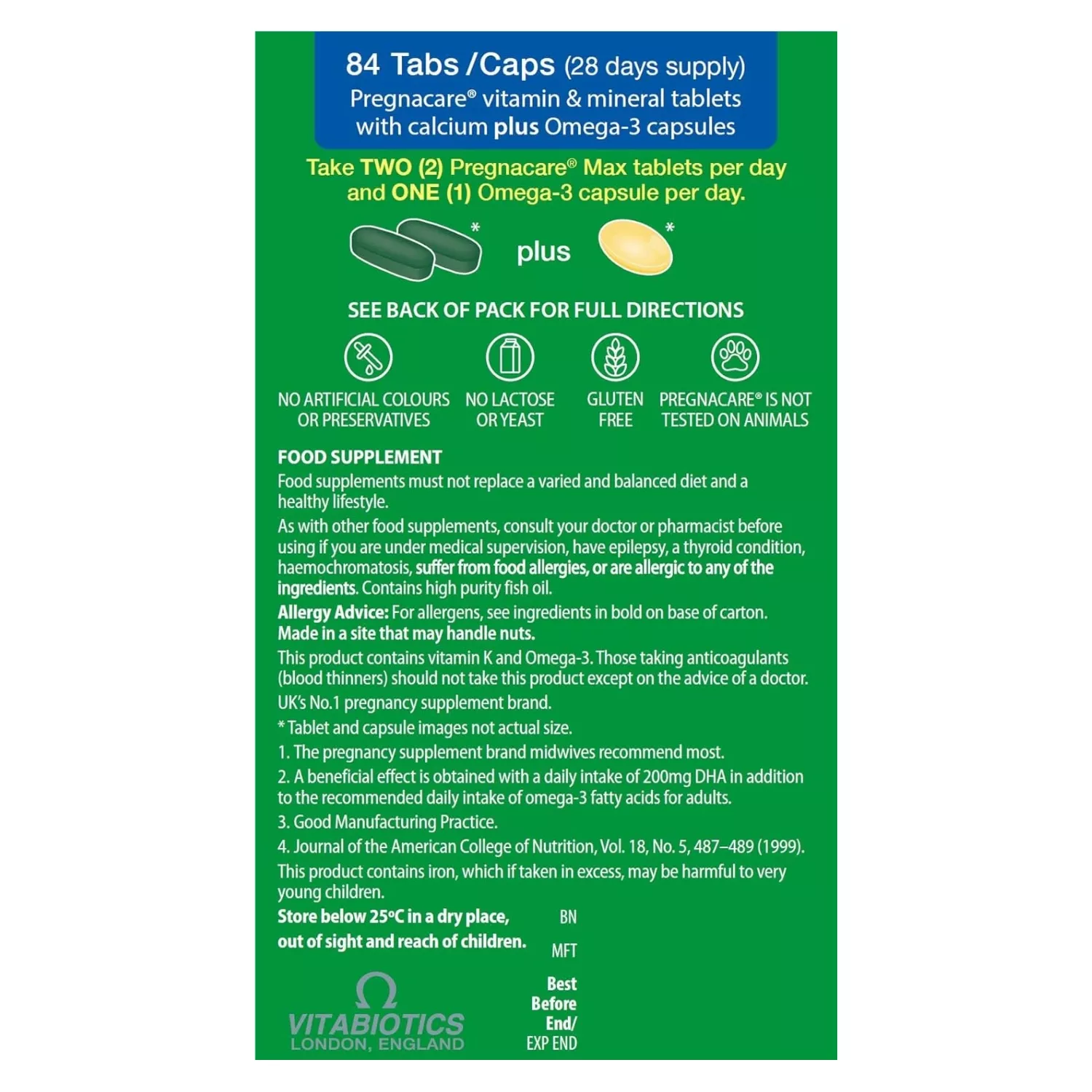 FOOD SUPPLEMENT Food supplements must not replace a varied and balanced diet and a healthy lifestyle. As with other food supplements, consult your doctor or pharmacist before using if you are under medical supervision, have epilepsy, a thyroid condition, haemochromatosis, suffer from food allergies, or are allergic to any of the ingredients. Contains high purity fish oil. Allergy Advice: For allergens, see ingredients in bold on base of carton. Made in a site that may handle nuts. This product contains vitamin K and Omega-3. Those taking anticoagulants (blood thinners) should not take this product except on the advice of a doctor. UK’s No.1 pregnancy supplement brand.