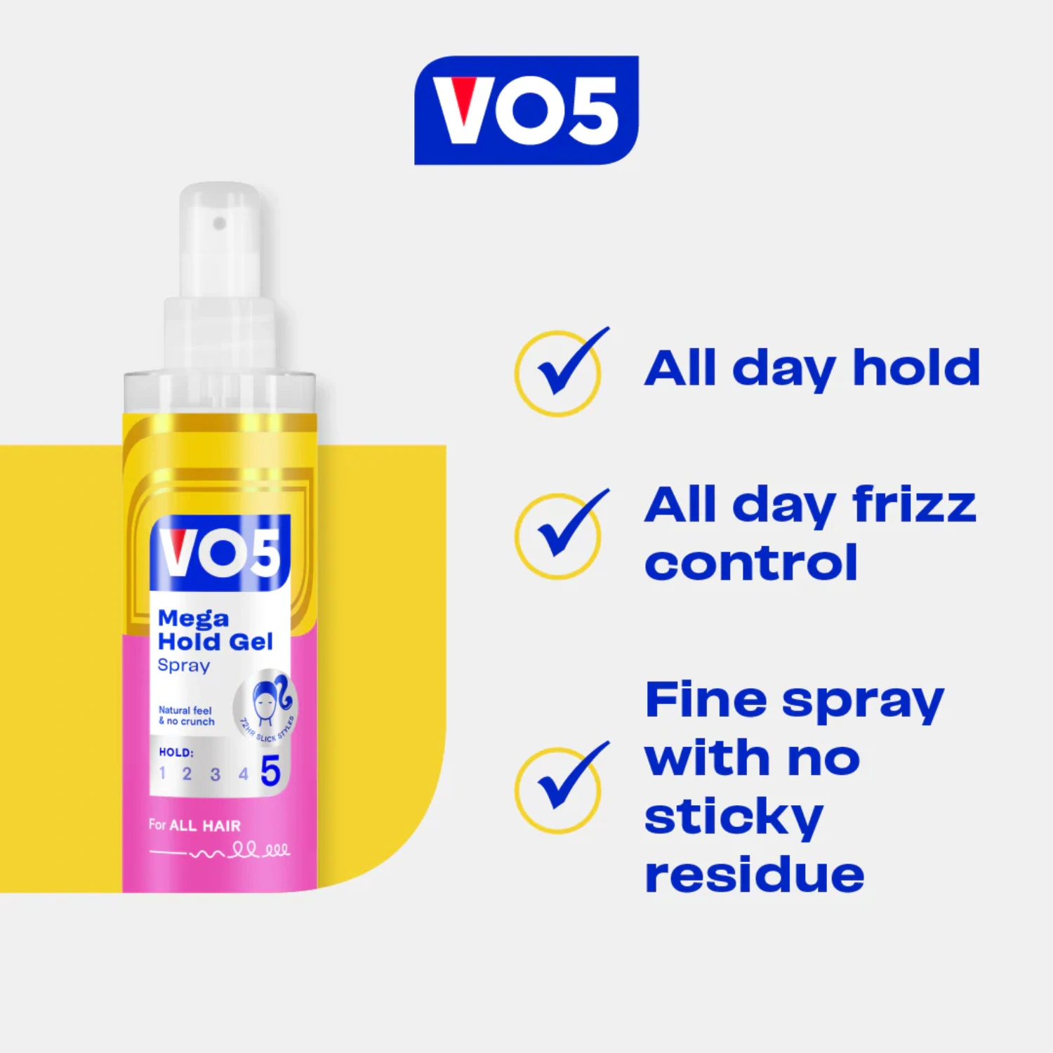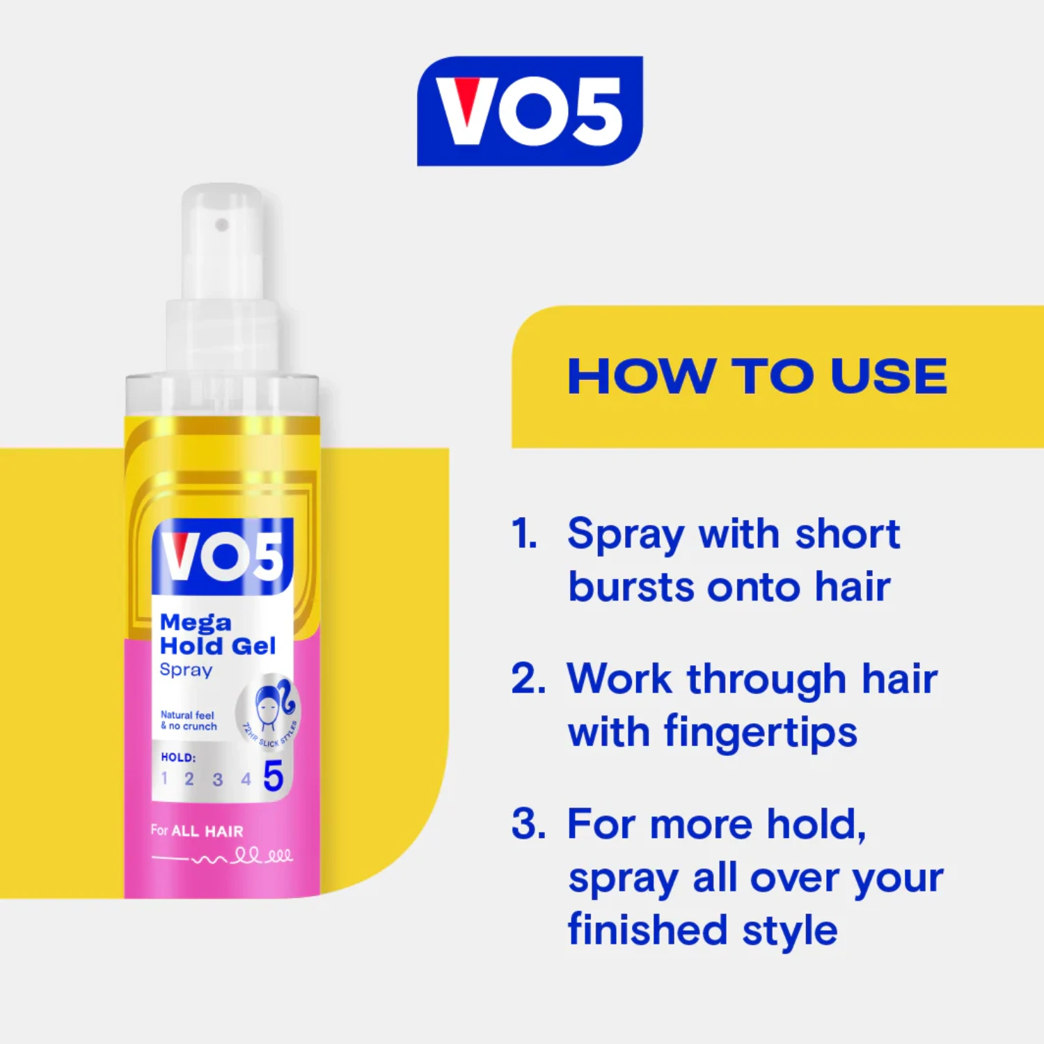 Introducing the new look VO5 Mega Hold Gel Spray – for an all-day hold. The VO5 Mega Hold Gel Spray gives you the hold of a gel with the convenience of a spray. This versatile product features a fine spray formulation and is designed to leave no sticky residue, whilst providing all-day hold. This spray also manages frizz control and has a UV filter. VO5 Gel Spray is ideal to create either daytime or evening styles with a high level of hold and none of the frizz. For the best results, use the product on towel dried hair. Spray with short, even bursts and work through with your fingertips. For even more hold, spray all over your hair when finished. If the pump becomes blocked, rinse spray pump in warm water. Check out the rest of the VO5 Gel Sprays, Mousses and Hairsprays – featuring different hold levels to keep your hair in place as you need.