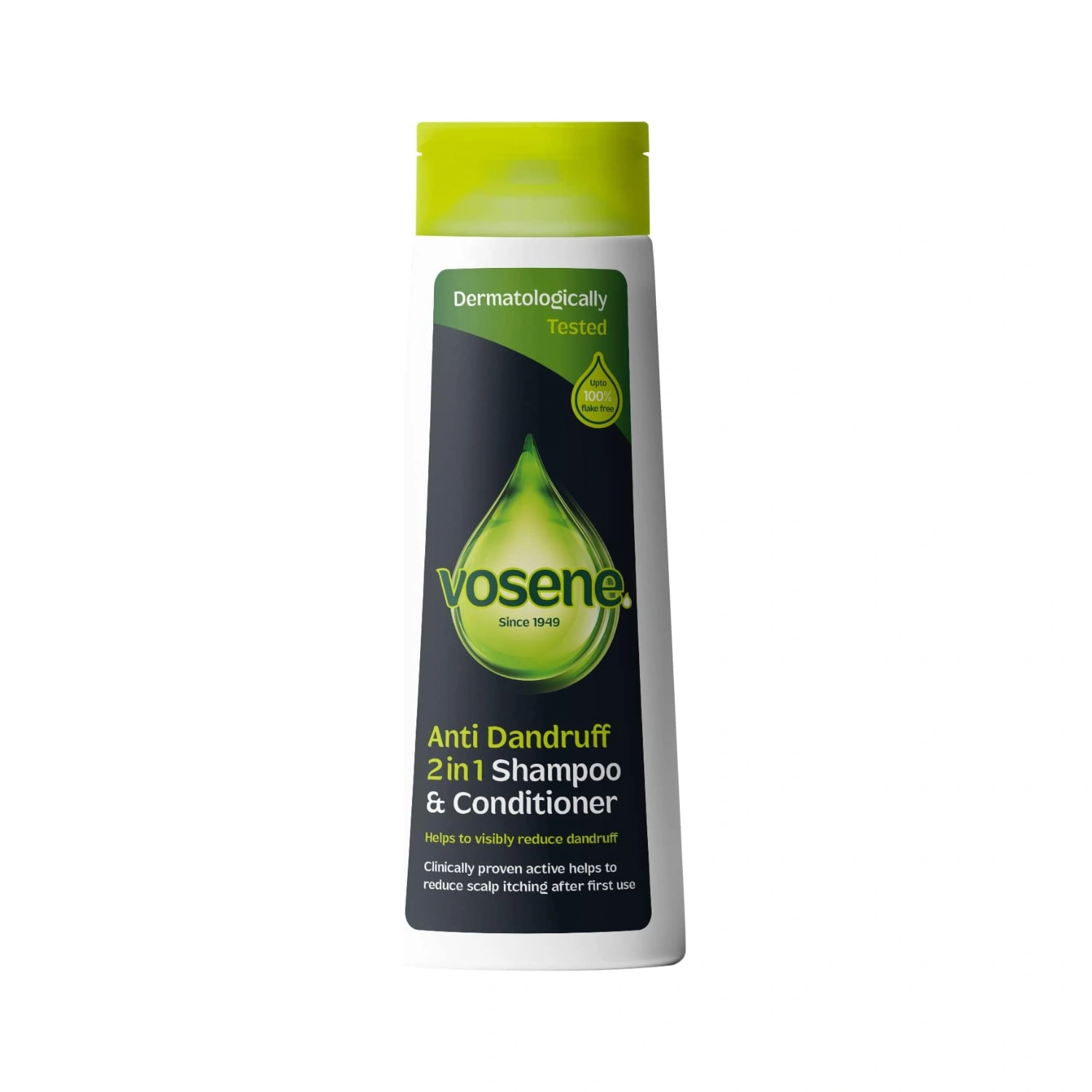 Vosene Anti Dandruff 2 in 1 Shampoo & Conditioner 500ml Perfect for quick & easy hair care, the Vosene Anti Dandruff 2in1 Shampoo & Conditioner helps to visibly reduce dandruff. Its clinically proven active helps to reduce scalp itching after first use. Contains panthenol, a conditioning ingredient that helps to strength and improve the texture of damaged hair preventing redness and soothing the scalp. Leaves hair soft, clean and up to 100% flake free.