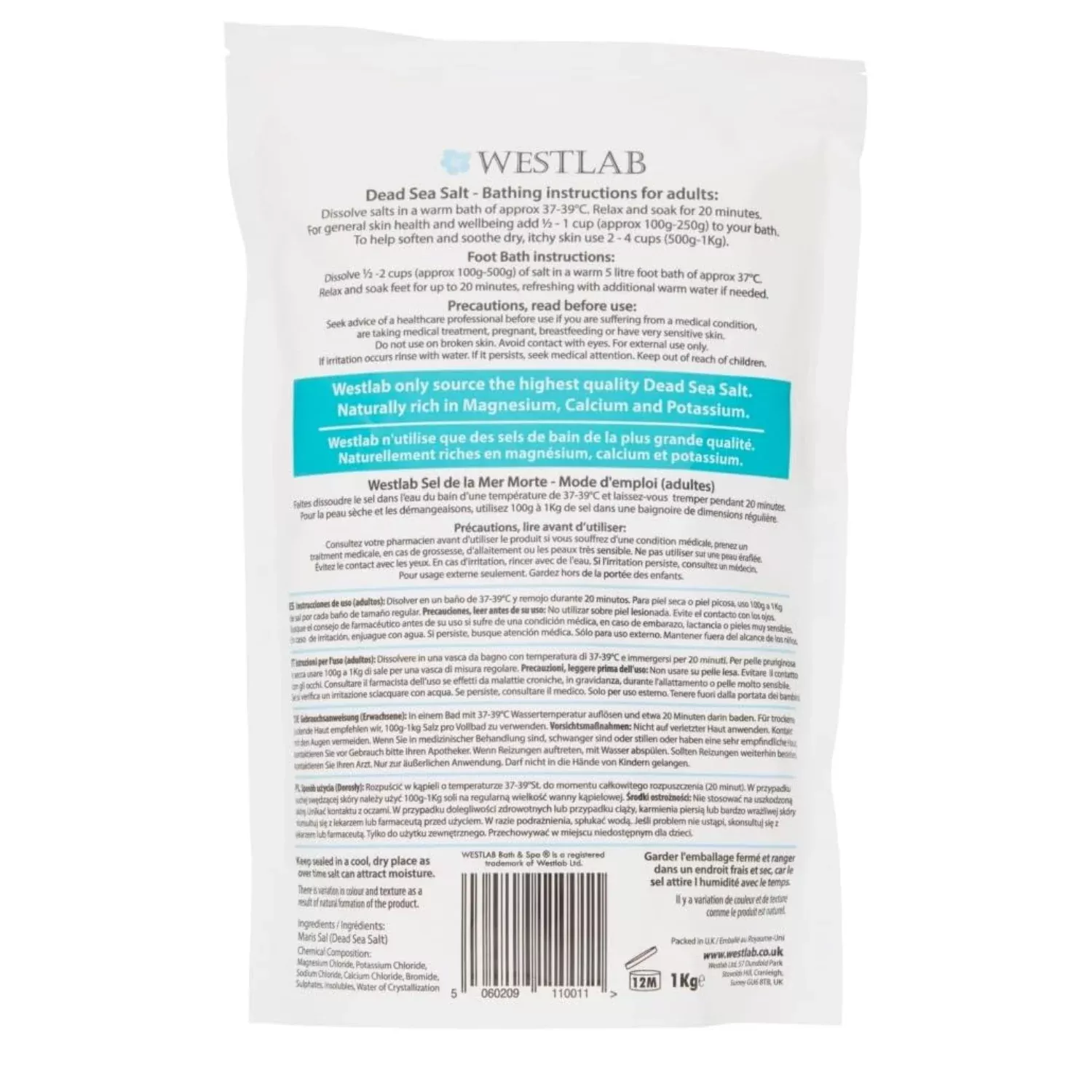 West lab dead sea salt is guaranteed authentic, it is used for private bath use and in spas. All natural, suitable for young children, dead sea salt. The intense feeling of well being after a 1kg dead sea salt bath is amazing. High grade, high magnesium dead sea salt. West lab dead sea salt magnesium levels are between 31 percent and 35 percent! Many of the benefits of dead sea salt are completely lost without high levels of magnesium.